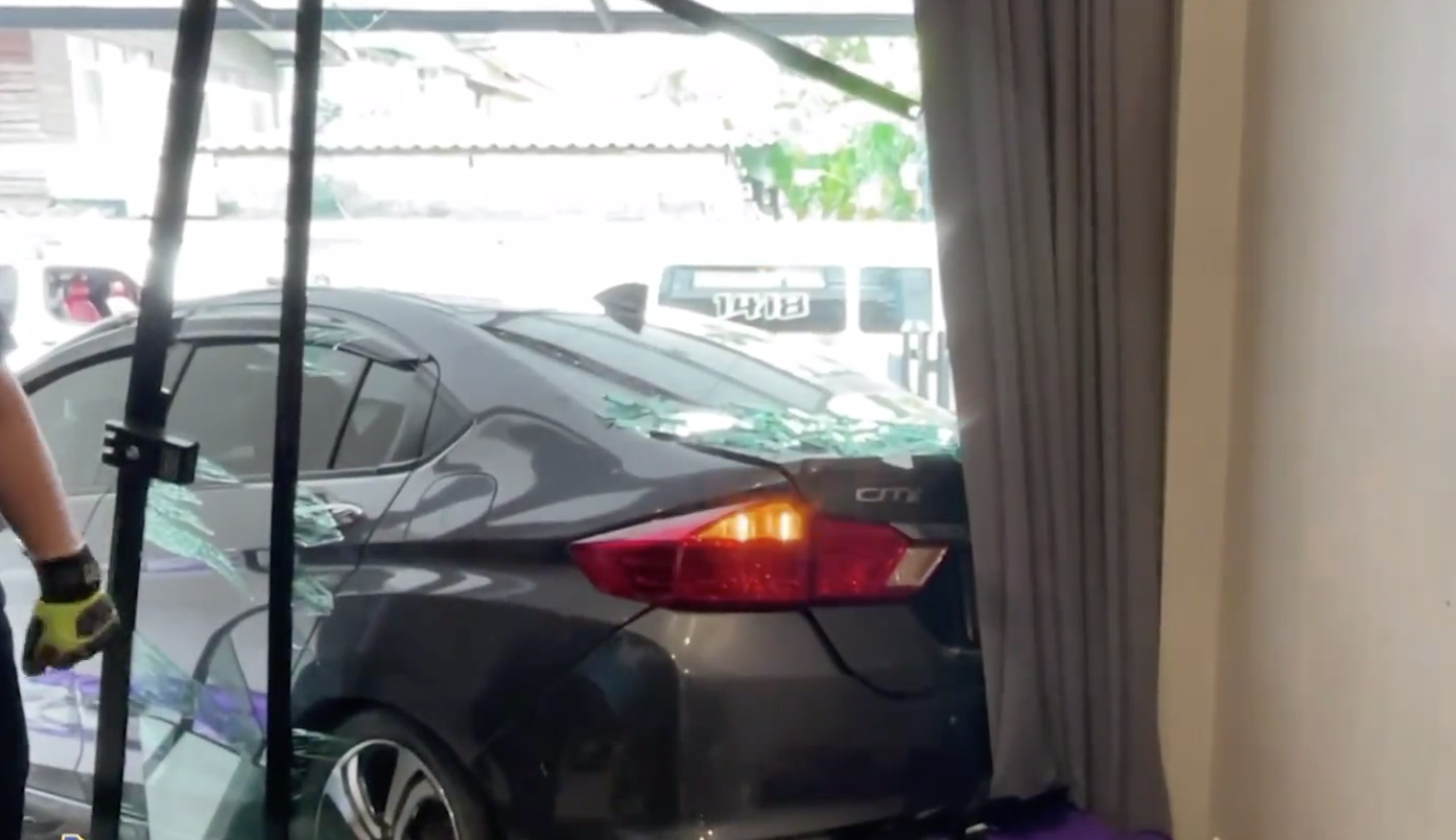 ขณะที่ตนกำลังถอยรถอยู่มองผ่านกระจกข้างรถ ทำให้หลงทิศทางในการหมุนพวงมาลัย จนรถถอยไปชนพื้นต่างระดับจนรถกระชาก ด้วยความตกใจจึงเหยียบคันเร่งพุ่งไปด้านหลังอย่างแรง จนชนกระจกประตูออฟฟิศ และพี่ชายที่กำลังโบกให้อยู่ด้านหลังรถได้รับบาดเจ็บ