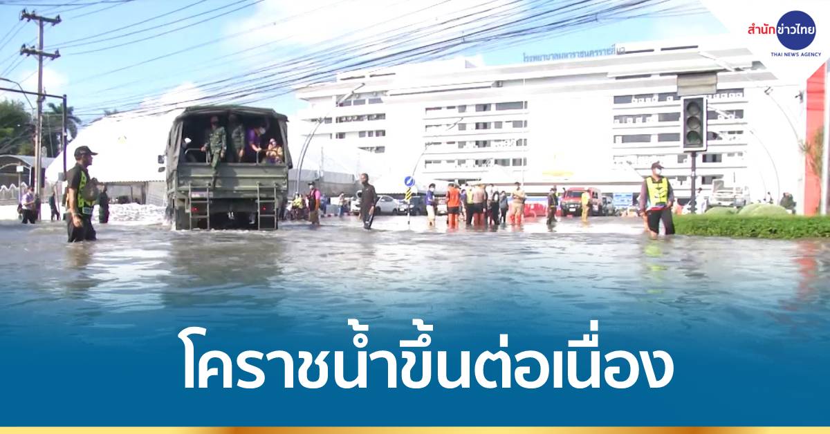 กระสอบทรายถูกน้ำมาวางเป็นแนวพนังป้องกันด้านหน้าไม่ให้น้ำทะลักเข้าท่วมตัวโรงพยาบาลมหาราชนครราชสีมา หลังมวลน้ำลำตะคอง ยังทยอยเพิ่มระดับอย่างต่อเนื่อง ล้นตลิ่งเข้าท่วมถนนด้านหน้าโรงพยาบาล ซึ่งได้แจ้งผู้ป่วยที่มีนัดตรวจวันนี้ เลื่อนออกไปก่อน 1 สัปดาห์ นายวิเชียร จันทรโณทัย ผู้ว่าราชการจังหวัดนครราชสีมา มาบัญชาการเหตุการณ์ด้วยตัวเองแต่เช้า โดยประชาสัมพันธ์ให้รถวิ่งช้าๆ เพื่อไม่ให้มวลน้ำกระแทกสร้างความเสียหายให้บ้านเรือนประชาชน รถเล็กไม่ควรผ่าน เพราะหากเครื่องดับ ก็จะเกิดปัญหาตามมา