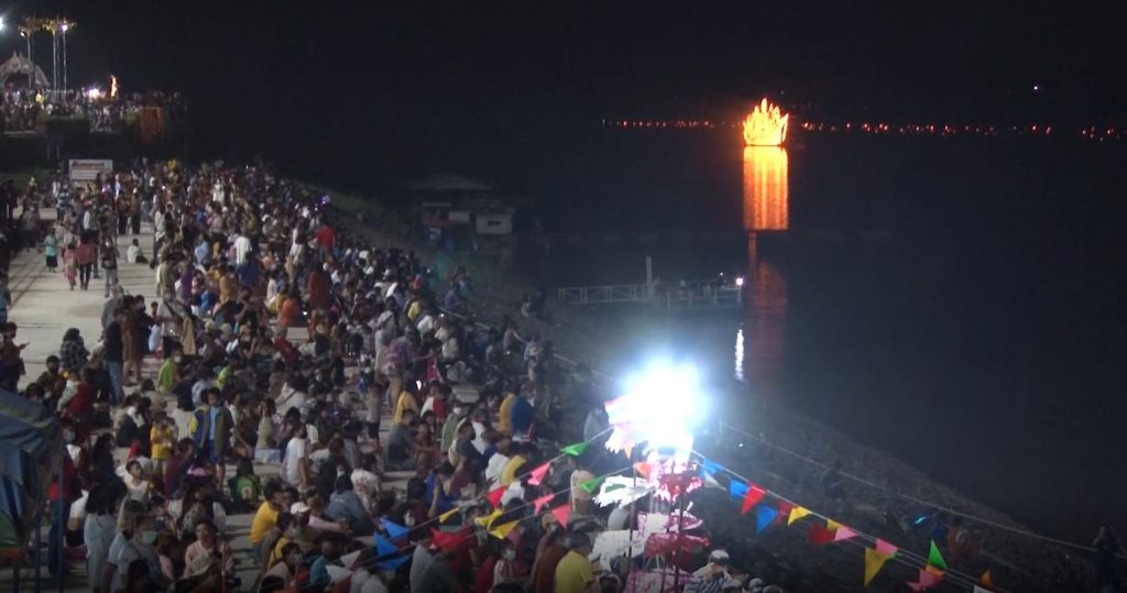 นครพนม 22 ต.ค.- นักท่องเที่ยวแห่ชมไหลเรือไฟโชว์ สืบสานไหลเรือไฟโบราณ คืนออกพรรษา ที่ จ.นครพนม