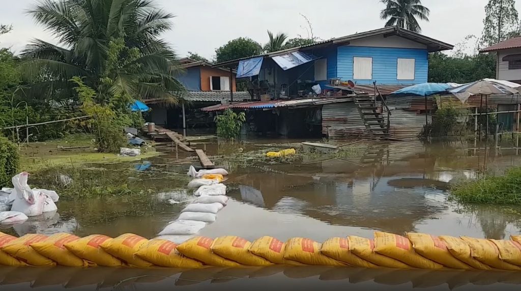 ส่วนคันกระสอบทรายกั้นน้ำ ถ.หน้าวัดลัดเสนาบดี จุดเชื่อมต่อ หมู่ที่ 1 ต.เขาท่าพระ และ หมู่ที่ 7 ต.ธรรมามูล ตอนนี้ระดับน้ำสูงขึ้นกว่า 1 เมตร ปริ่มคันกระสอบทราย ชาวบ้าน เจ้าหน้าที่ ฝ่ายปกครอง ต้องเร่งเสริมคันกระสอบทรายขึ้นอีก 2 ชั้น เป็น 4 ชั้น รวมระยะทาง กว่า 700 เมตร เพื่อป้องกันไม่ให้น้ำทะลักเข้าท่วมหมู่บ้านชั้นใน