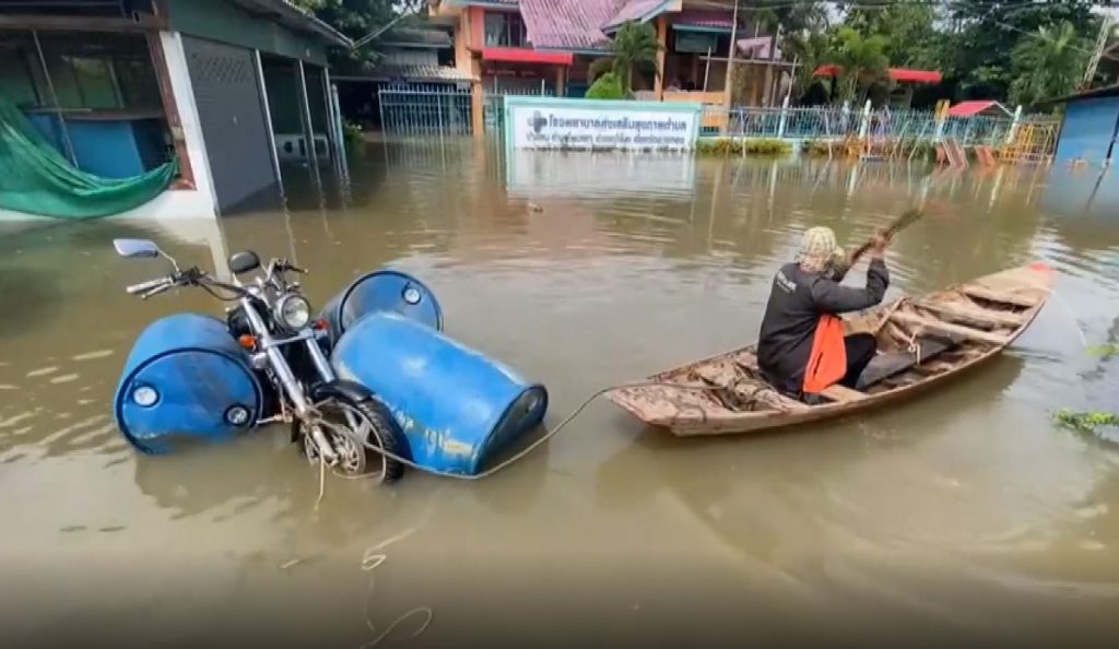 ท่วมถึงขื่อ ชาวอ่างทองใช้แกลลอนขนรถหนีน้ำระลอกสอง
