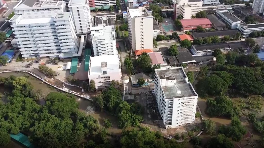 จากภาพมุมสูงจะเห็นได้ว่า บริเวณหน้าโรงพยาบาลมหาราช น้ำลดระดับต่ำกว่าทางเท้า ยังมีท่วมขังในบางจุด รถยนต์และมอเตอร์ไซค์สามารถสัญจรได้แล้ว แต่ยังมีรถทหารไว้บริการสำหรับเจ้าหน้าที่ของโรงพยาบาล และผู้ป่วยที่จะเดินทางเข้ารับบริการ