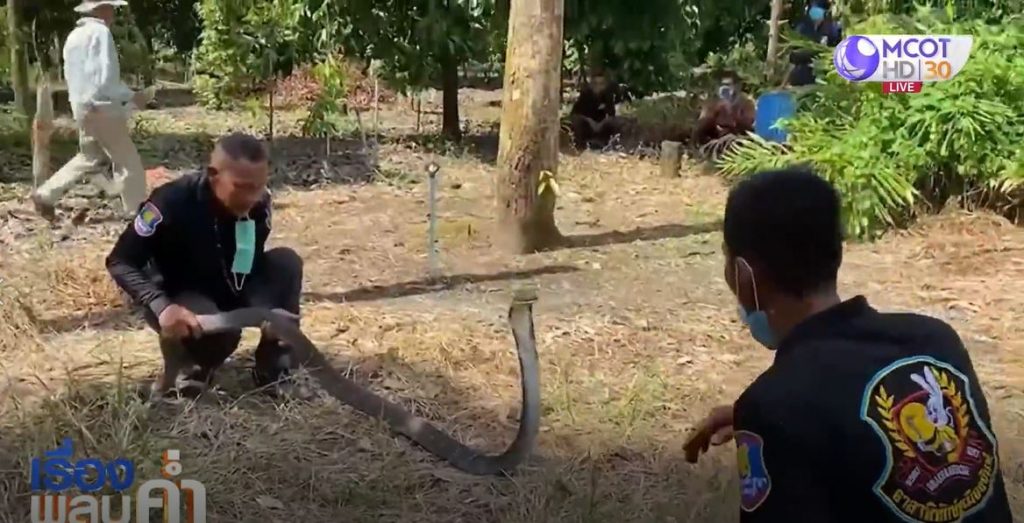 ทันทีที่ไปถึงก็เจองูจงอางที่พยายามซุกตัวหลบอยู่บนยอดต้นมังคุดอายุประมาณ 30 ปี สูง 15 เมตร เจ้าหน้าที่จึงนำบันไดสูงมาพาดปีนขึ้นไปเตรียมจับงู แต่ทันทีที่งูเห็นว่ามีคนมามุงเตรียมจะจับ ได้พยายามเลื้อยหนีขึ้นไปบนยอดต้นไม้ ทีมงานที่อยู่ข้างล่างจึงใช้ตะขอยาวช่วยไล่เกี่ยวคล้อง แต่งูเลื้อยหนีไปที่ปลายกิ่ง ก่อนพุ่งเหินข้ามไปเกาะต้นมังคุดอีกต้น