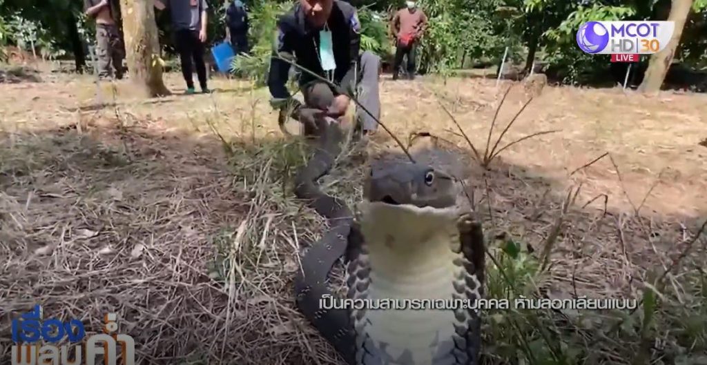 สิบเอกณัฐพล เสืองาม ผู้เชี่ยวชาญทีมงานอสรพิษวิทยา ใช้ทักษะหลอกล่อสะกดให้จงอางที่ตื่นกลัวชูคอแผ่แม่เบี้ย ให้อยู่ในอาการสงบ จากนั้นใช้มือเปล่าจับงูจงอางได้สำเร็จ