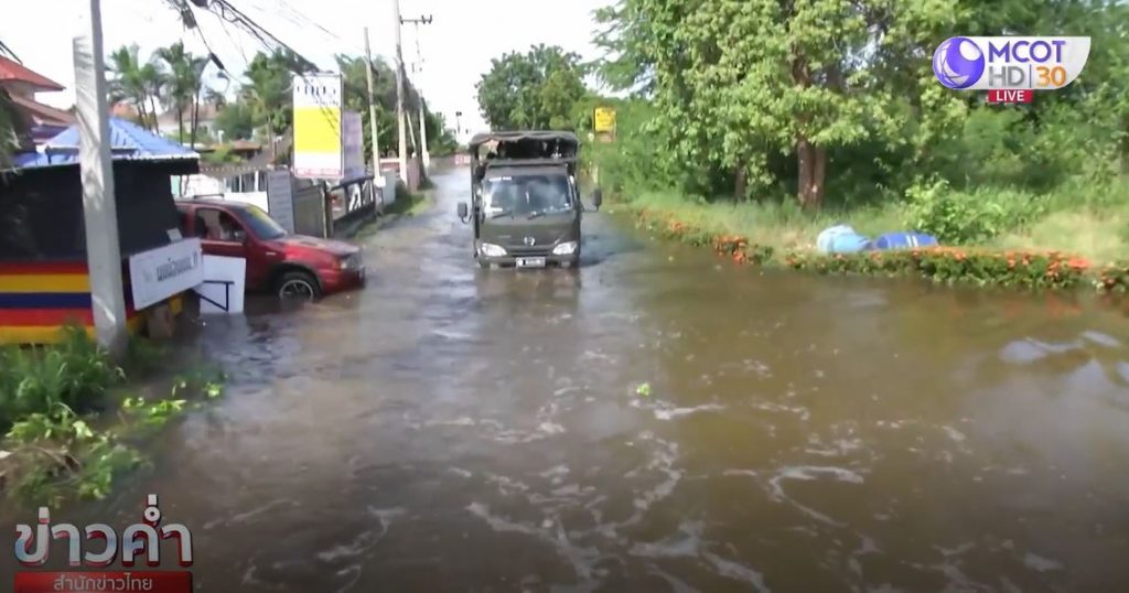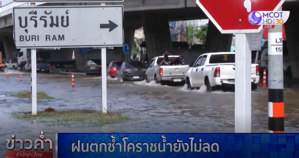มวลน้ำยังขยายวงจากพื้นที่ชุมชนไหลบ่าเข้าท่วมถนนมิตรภาพ ใกล้สี่แยกจอหอ ทำให้รถที่ใช้เส้นทางเคลื่อนตัวได้อย่างช้าๆ