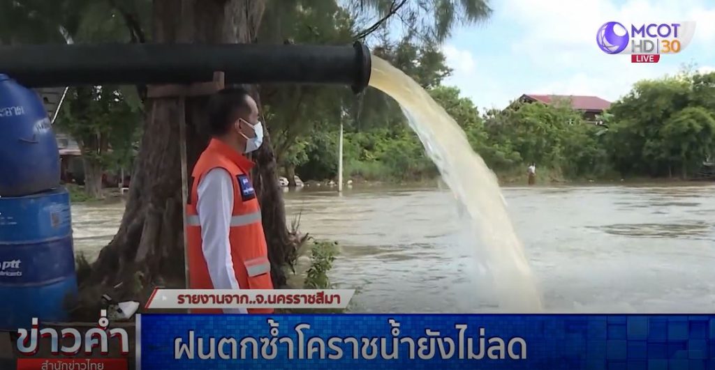 ขณะที่ประตูระบายน้ำกันผม อำเภอเฉลิมพระเกียรติ จังหวัดนครราชสีมา ที่ลำบริบูรณ์ไปรวมกับลำตะคอง ก่อนไหลลงสู่แม่น้ำมูล 3 กิโลเมตร เจ้าหน้าที่ได้ไปติดตั้งเครื่องสูบน้ำแรงดันสูง หรือ Hydro Flow ตามคำสั่งการของอธิบดีกรมชลประทาน เพื่อเร่งระบายน้ำออกจากพื้นที่น้ำท่วม