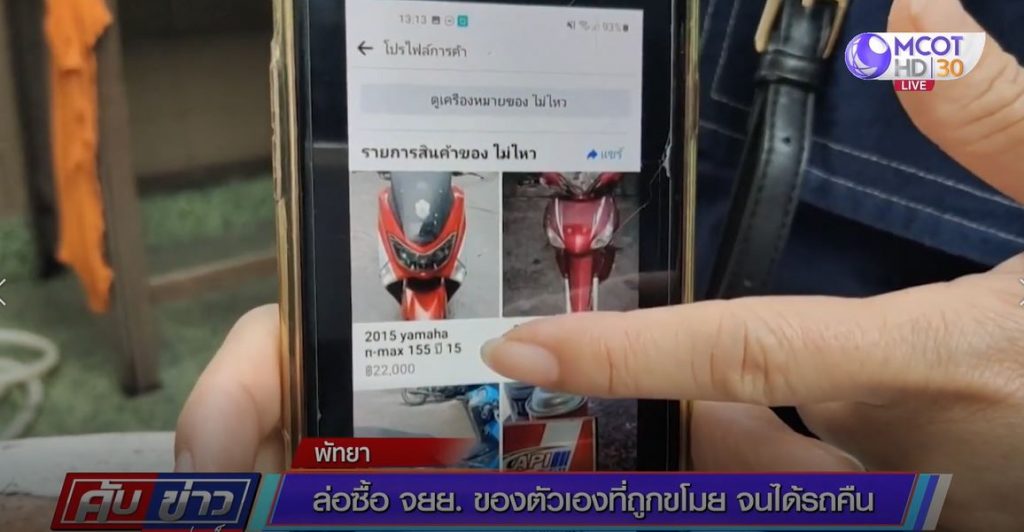นางสาวสร้อยสิริน อายุ 36 ปี เล่าว่า คนร้ายทักมาตามหน้าเพจรถเช่าของร้าน โดยพูดคุยตกลงก่อนนัดไปส่งรถให้คนร้าย จากนั้นเมื่อถึงเวลาส่งรถจักรยานยนต์ก็ไม่สามาถติดต่อได้ จนไปเข้าเพจขายรถจักรยานยนต์มือสองจึงพบรถจักรยานยนต์พีซีเอ็กซ์ของตนถูกประกาศขาย พร้อมมีคู่มือรถ เมื่อมองดีๆ จะพบว่าไม่ใช่ของจริง ซึ่งได้แจ้งความไว้ที่ สภ.เมืองพัทยา แต่พนักงานสอบสวนบอกทำอะไรไม่ได้ ต้องออกหมายเรียกก่อน ซึ่งตนเห็นว่าล่าช้าเลยต้องปลอมเป็นลูกค้าซื้อรถจักรยานยนต์โดยตรงลงซื้อและนัดไปเอารถ ซึ่งคนร้ายคาดว่าจะถูกตำรวจจับ เลยเอารถจอดทิ้งไว้ ก่อนหลบหนีไป ถือว่าโชคดีได้รถคืน
