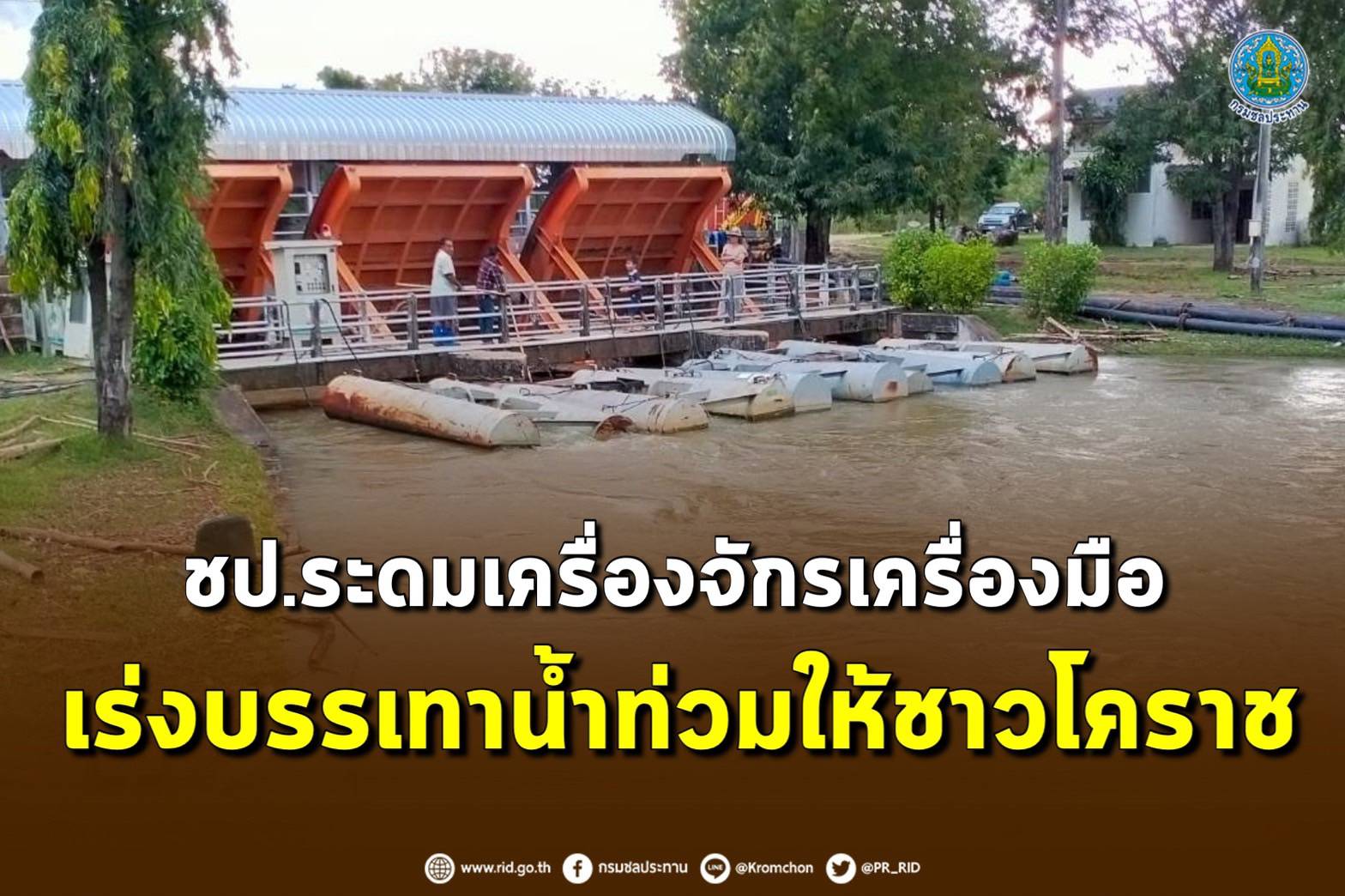 นายประพิศ จันทร์มา อธิบดีกรมชลประทานเปิดเผยว่า สั่งการให้นำเครื่องผลักดันน้ำและเครื่องสูบน้ำไปติดตั้งเพิ่มเพื่อแก้ไขภาวะน้ำท่วมในจังหวัดนครราชสีมาซึ่งได้รับผลกระทบ 7 อำเภอ ได้แก่ สีคิ้ว สูงเนิน เมืองนครราชสีมา คง ด่านขุนทด โนนสูงไทย และโนนสูง โดยติดตั้งเครื่องผลักดันน้ำ 3 เครื่องและเครื่องสูบน้ำ 2 เครื่องที่ประตูระบายน้ำ (ปตร.) จอหอ ติดตั้งเครื่องผลักดันน้ำ 5 เครื่องและเครื่องสูบน้ำ 2 เครื่องที่ ปตร.ข่อยงาม ติดตั้งเครื่องสูบน้ำ Hydroflow 1 เครื่อง ที่ปตร.กันผมเพื่อเร่งระบายน้ำในแม่น้ำลำตะคองลงสู่แม่น้ำมูล รวมทั้งติดตั้งเครื่องผลักดันน้ำ 14 เครื่องเพื่อเร่งระบายน้ำที่ลำเชียงไกร