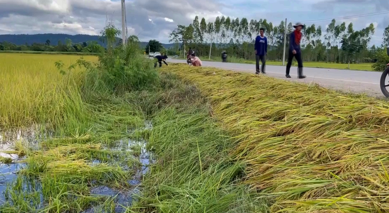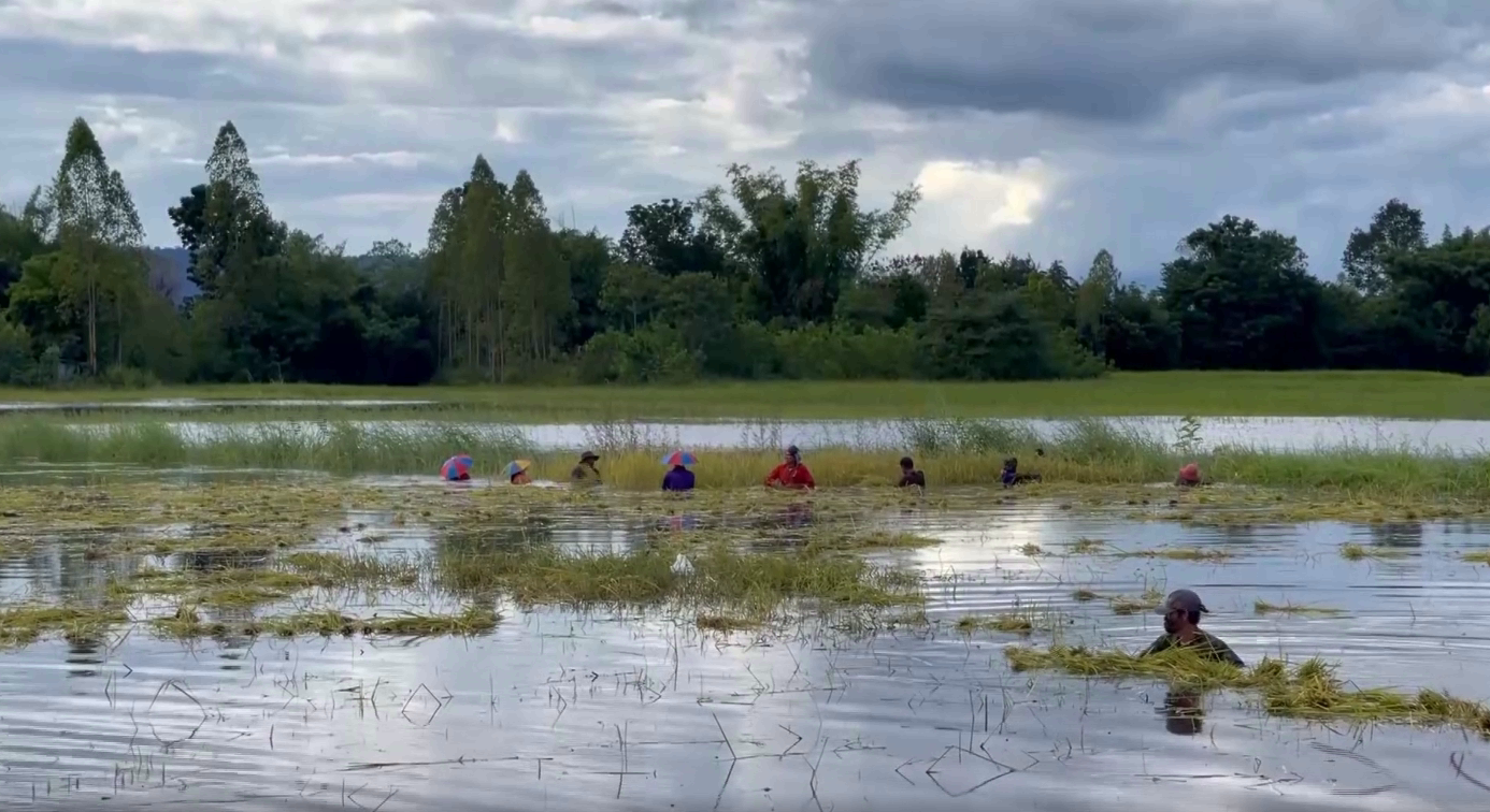 บริเวณริมถนนสายอำเภอโนนสัง ไปอำเภออุบลรัตน์ บริเวณบ้านโสกจาน ตำบลโนนสัง อำเภอโนนสัง จังหวัดหนองบัวลำภู ชาวบ้านกว่า 30 คนได้ดำลงไปในน้ำเกี่ยวข้าวขึ้นมา โดยหลังจากเกี่ยวเสร็จได้นำใส่เรือและพายนำข้าวที่เปียกน้ำเข้ามาที่ฝั่ง นำไปตากไว้ที่บริเวณริมถนนเป็นทางยาว ซึ่งรวงข้าวทั้งหมดกำลังออกรวงเหลืองอร่าม พร้อมที่จะเก็บเกี่ยวได้แล้ว