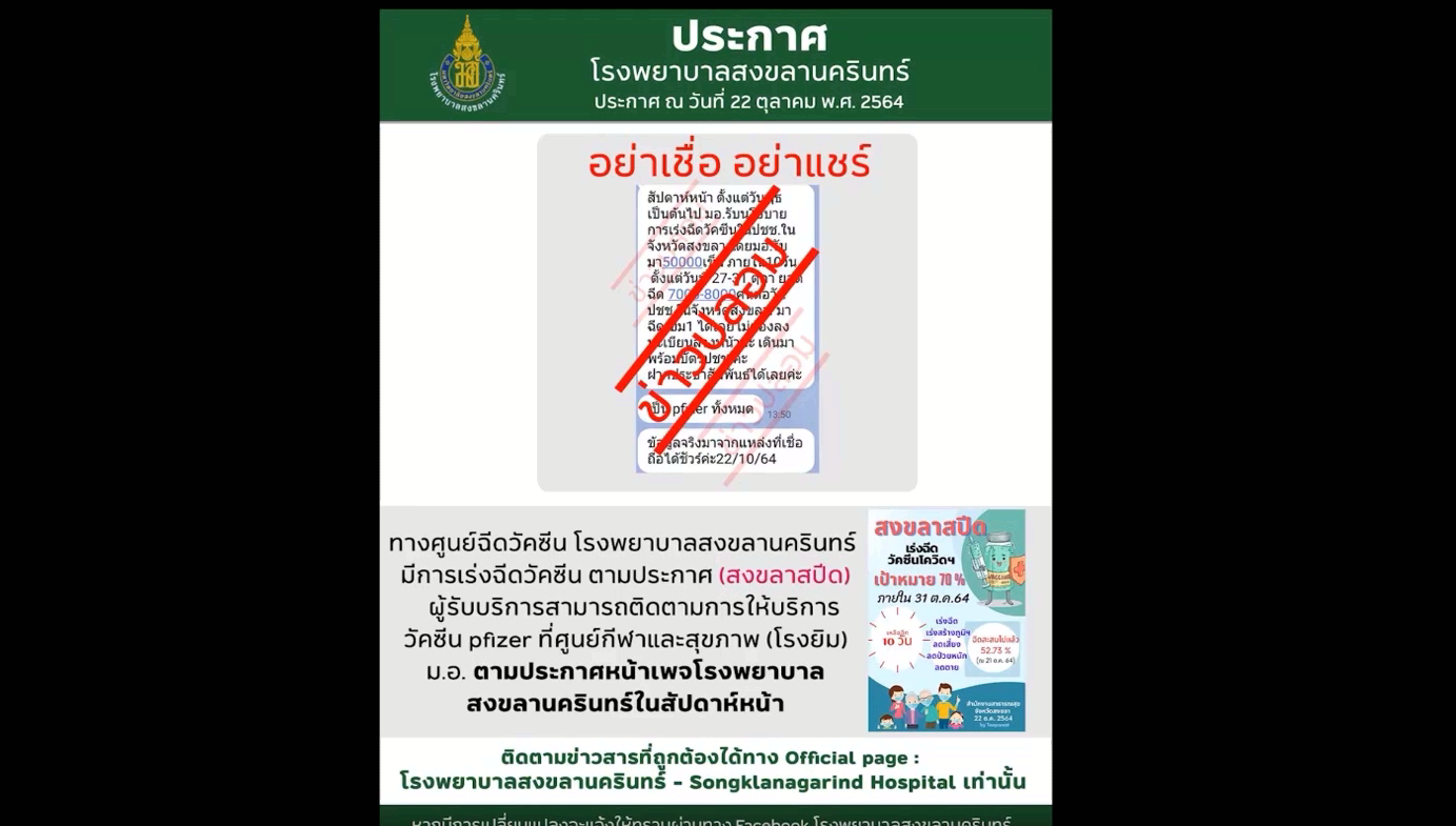 ส่วนที่โรงพยาบาลสงขลานครินทร์ (ม.อ.) อ.หาดใหญ่ จ.สงขลา ได้ออกมาประกาศขอความร่วมมืองดส่งข่าวปลอม ฉีดวัคซีนโควิด 50,000 โดส ช่วงสัปดาห์หน้า ตามนโยบายสงขลาสปีด หวั่นประชาชนเข้าใจผิด หลังจากมีการแชร์ข้อความต่อกันในสื่อโซเชียลกันเป็นจำนวนมาก โดยข้อความในข่าวปลอมดังกล่าวระบุว่า “สัปดาห์หน้า ตั้งแต่วันพุธเป็นต้นไป มอ.รับนโยบายการเร่งฉีดวัคซีนใน ปชช.ในจังหวัดสงขลา โดย มอ. รับมา 50,000 เข็ม ภายใน 10 วัน ตั้งแต่วันที่ 27-31 ตุลาคม ยอดฉีด 7,000-8,000 คน ต่อวัน ปชช.ในจังหวัดสงขลา มาฉีดเข็ม 1 ได้เลยไม่ต้องลงทะเบียนล่วงหน้าค่ะ เดินมาพร้อมบัตร ปชช. ค่ะ ฝากประชาสัมพันธ์ได้เลยค่ะ”