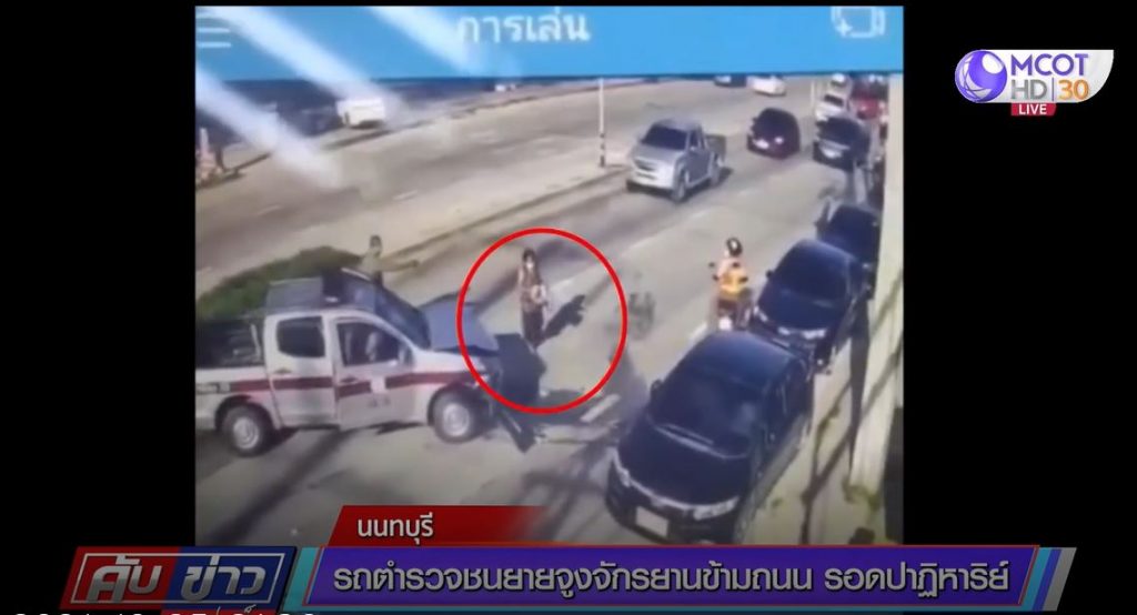 กล้องวงจรปิดที่เกิดเหตุจับภาพคุณยายอายุ 80 ปี อยู่เกาะกลางถนน กำลังจูงรถจักรยานเพื่อจะข้ามถนนมาอีกฝั่ง ปรากฏว่ามีรถยนต์สีขาววิ่งมาบริเวณเลนกลางและชะลอความเร็ว มีรถจักรยานยนต์ขี่ย้อนศรมาหลัง จากนั้นมีรถตำรวจวิ่งมาเลนขวา ขณะที่ยายอายุ 80 ปี เข็นรถจักรยานลงมาจากทางเท้าพอดี โดยล้อหน้ายื่นมาที่ถนน ทำให้รถตำรวจหักหลบไปเสยท้ายรถคันสีขาว ทำให้รถสะบัดไปกระแทกกับด้านหน้ารถจักยานของคุณยาย ก่อนด้านหน้ารถไปชนกับรถเก๋งสีดำที่จอดอยู่ข้างทางเสียหาย โชคดีคุณยายปลอดภัย ไม่ได้รับบาดเจ็บ