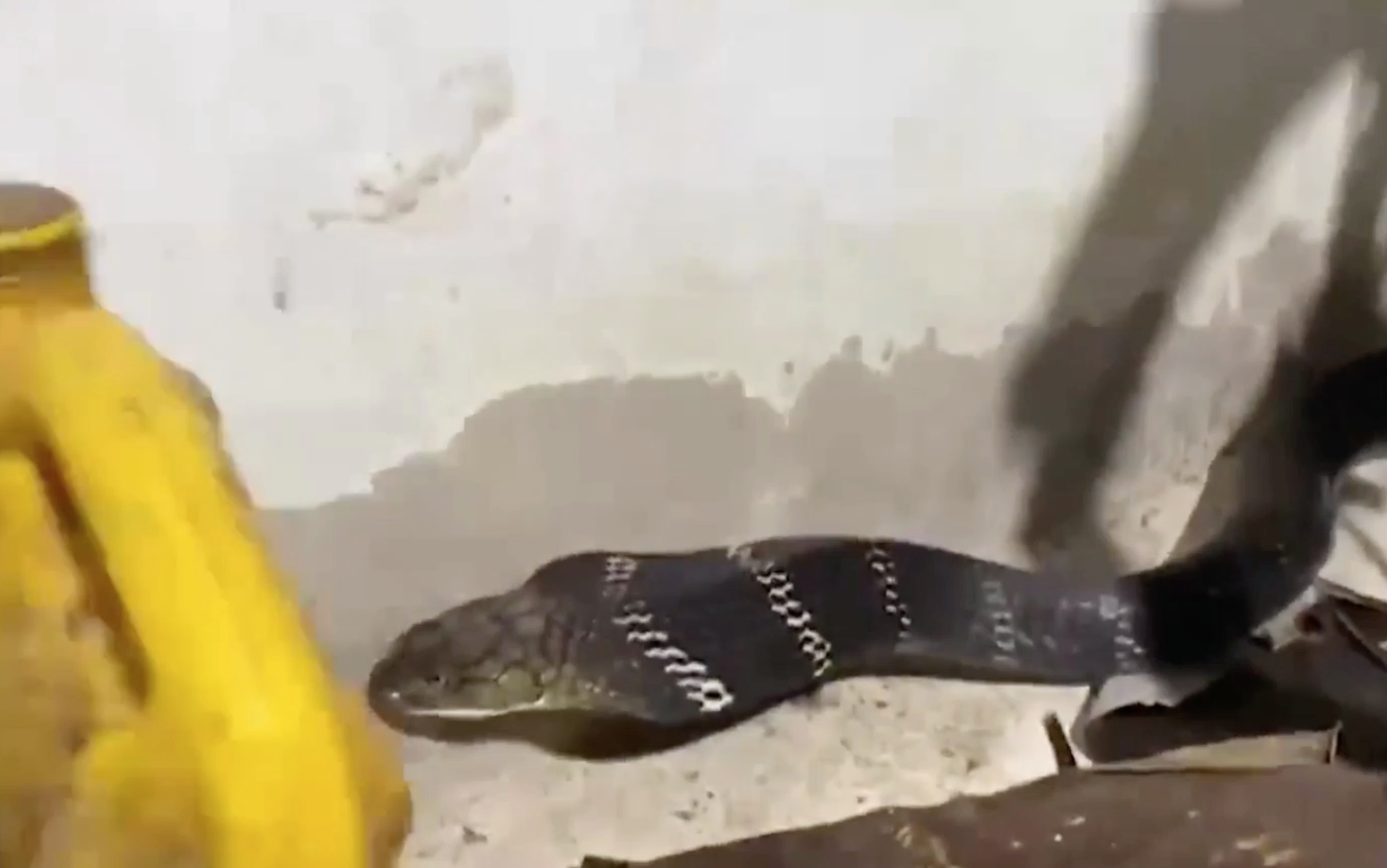 ส่วนงูที่เลื้อยหนีอีกตัว เข้าไปซ่อนอยู่ใต้กองกระเบื้องหลังคาข้างโรงจอดรถ แต่กลับไม่ใช่จงอาง แต่เป็นงูสิงหางลาย ตัวขนาดใหญ่ ยาวประมาณ 3 เมตร ซึ่งเป็นงูไม่มีพิษ สิบเอกณัฐพล จึงใช้มือเปล่าค่อยๆ จับตัวงูตัวที่ 2 ใส่กล่องพลาสติก เพื่อนำกลับไปพักฟื้นและสังเกตอาการณ์ ก่อนปล่อยป่า ทั้งบอกว่ากรณีจงอางกอดรัดงูสิงหางลายไม่ใช่การเกี้ยว หรือผสมพันธุ์ แต่เป็นพฤติกรรมของงูจงอางกำลังจะกินงูสิง เพราะงูจงอางไม่สามารถผสมข้ามสายพันธุ์ได้ โดยธรรมชาติงูสิงจะเป็นอาหารหลักของงูจงอาง ซึ่งเป็นงูด้วยกัน