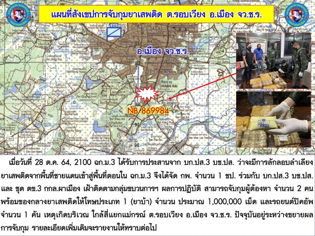 เชียงราย 29 ต.ค.-ทหารร่วมกับตำรวจปราบปรามยาเสพติด รวบ 2 นักค้ายาเสพติดพร้อมยาบ้า 1 ล้านเม็ด ขณะขนจากชายแดนเข้าตัวเมืองเชียงราย