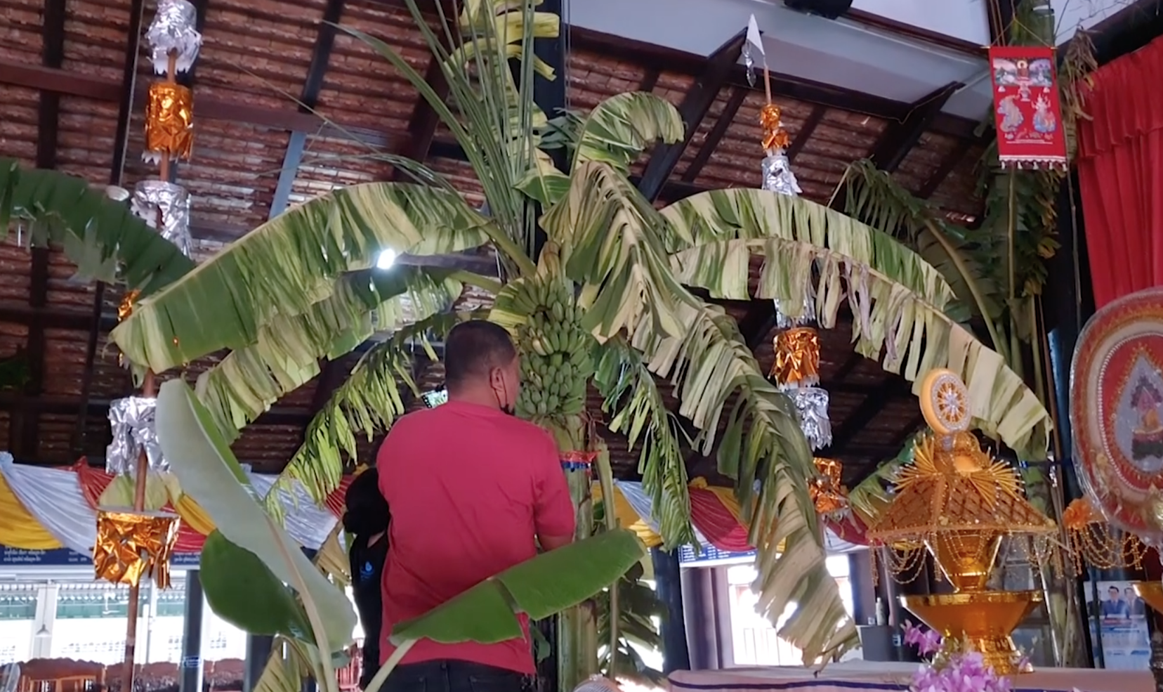 ผู้สื่อข่าวตามไปดูที่วัด เห็นต้นกล้วยเรียงรายผูกติดไว้กับเสา มีทั้งกล้วยน้ำว้า กล้วยหอม และกล้วยไข่ โดยเสาด้านในสุดก็พบต้นกล้วยด่างผูกติดไว้กับเสา มีความสูงเกือบ 3 เมตร มีเครือกล้วยด่าง 1 เครือ ใน 1 เครือมี 9 หวี ผู้ที่นำมาถวายให้วัดคือ นายวินัย จิตรอำพัน เจ้าของสวนวินัยกระโจมทอง