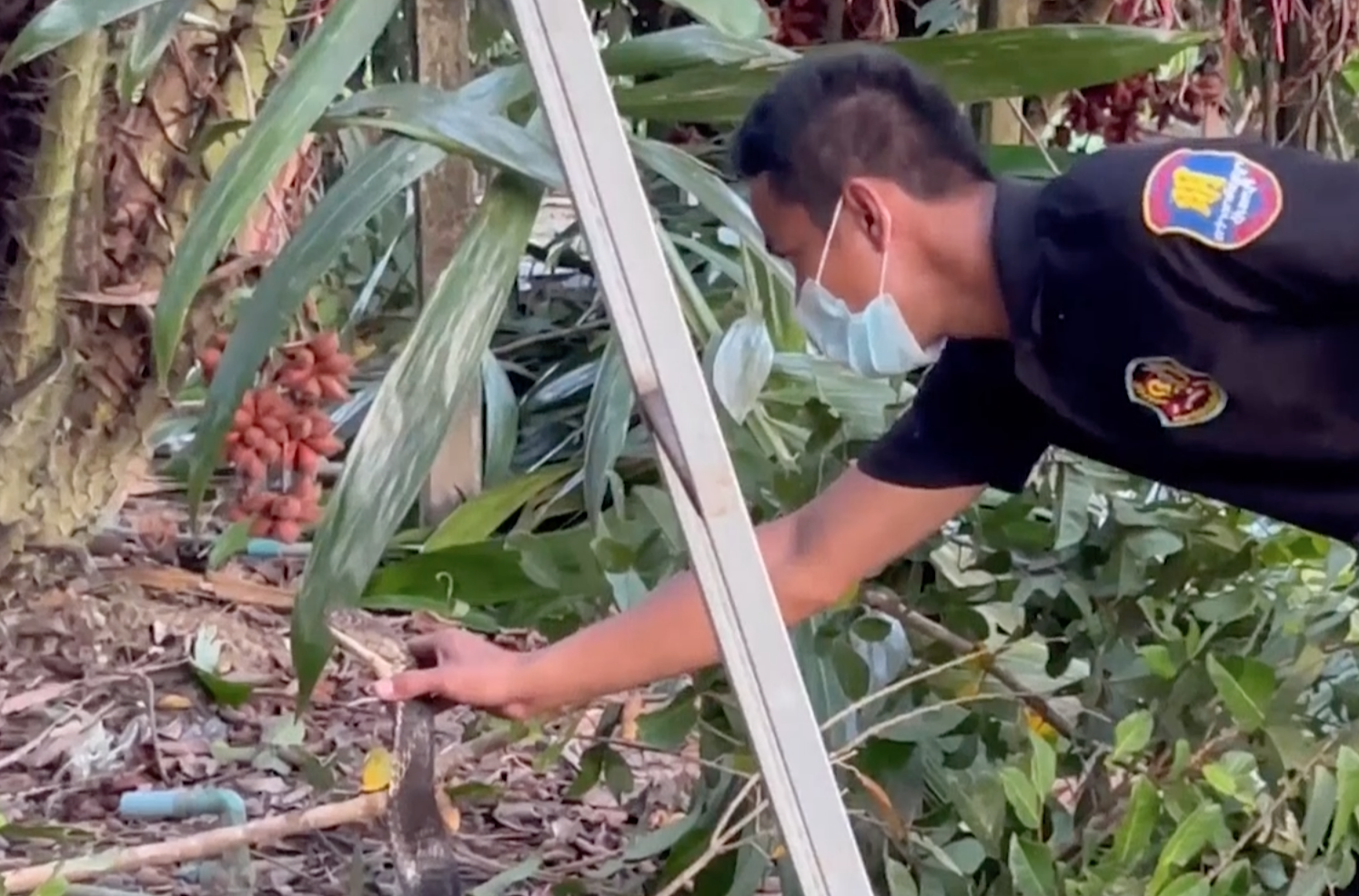 ทีมอาสาพิทักษ์งู เมืองจันทบุรี ได้รับแจ้งจาก นางจันทรา เชื้อไทย อายุ 59 ปี เจ้าของสวนผลไม้ ให้มาช่วยจับงูจงอางขนาดใหญ่ ที่เลื้อยอยู่บนยอดกิ่งต้นเงาะในสวนผลไม้ พื้นที่หมู่ 8 ตำบลสองพี่น้อง อำเภอท่าใหม่ จังหวัดจันทบุรี