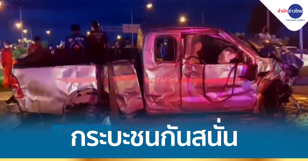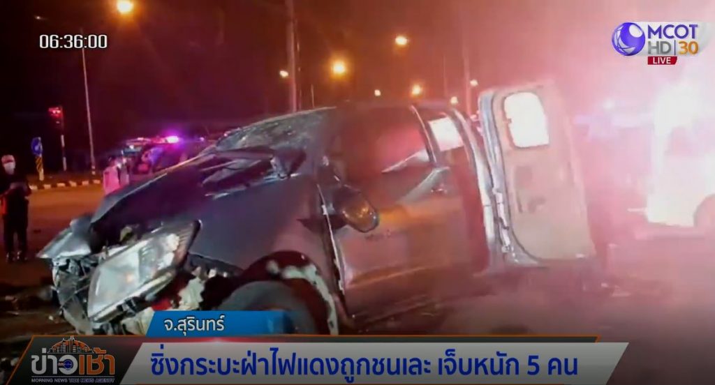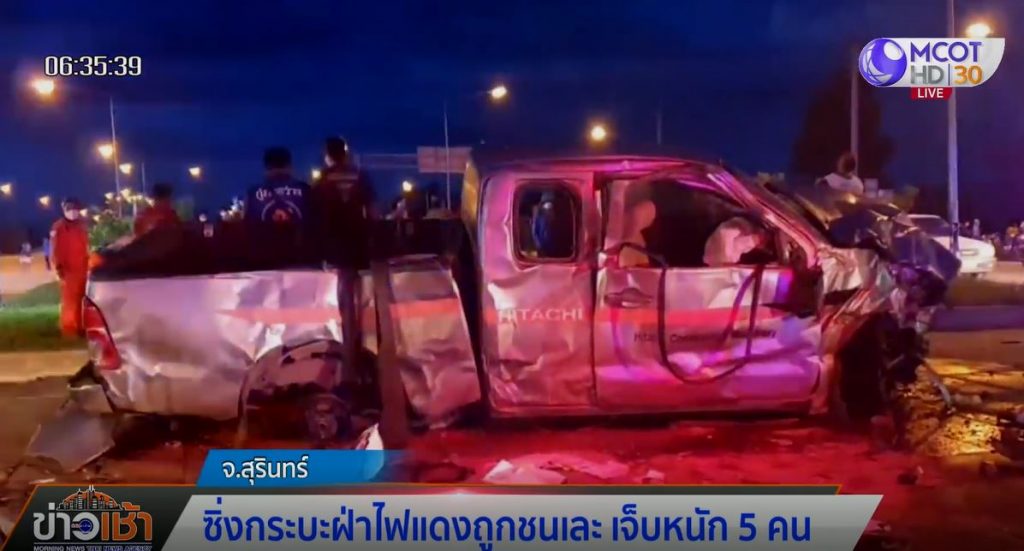 สุรินทร์ 3 พ.ย. – ตำรวจ ตชด.21 ซิ่งรถกระบะออกจากค่าย ฝ่าไฟแดงกลางสี่แยกถนนตัดใหม่สุรินทร์-บุรีรัมย์ ถูกรถกระบะอีกคันพุ่งชน รถพังยับ บาดเจ็บ 5 คน