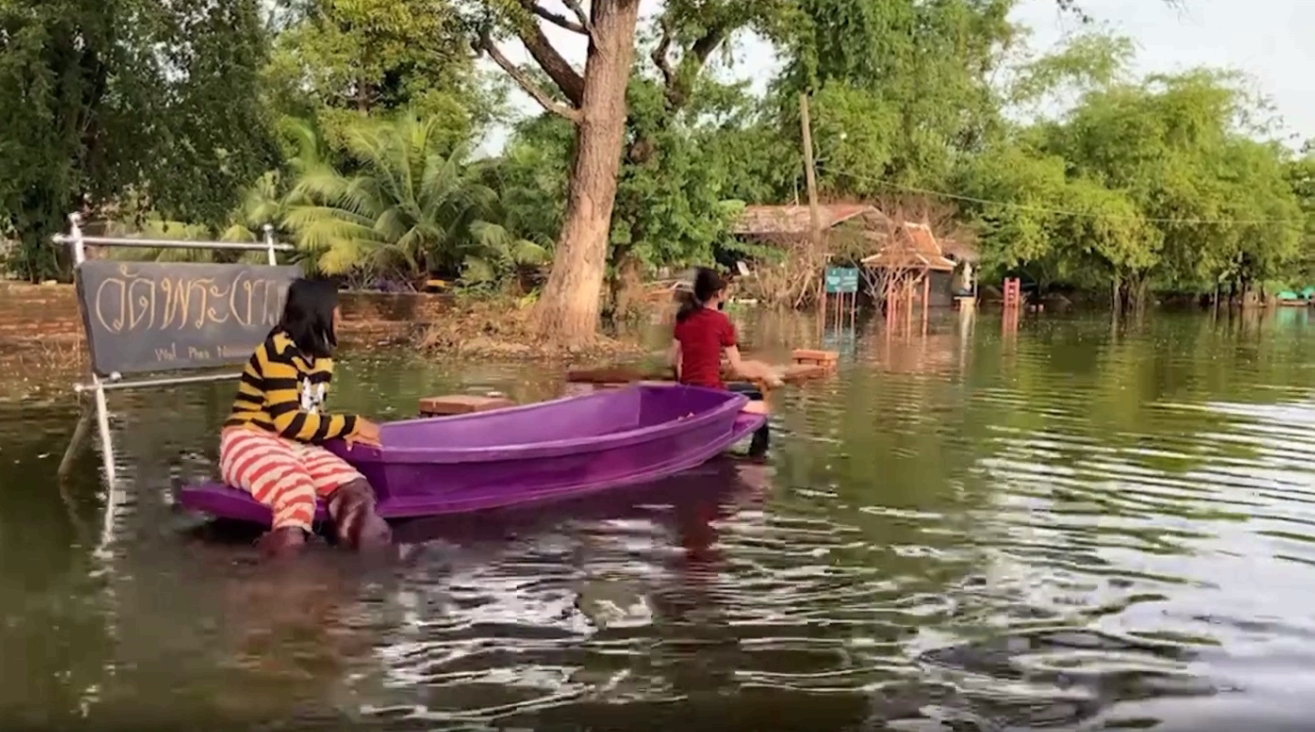 เด็กหญิงวัย 10 ขวบ บอกว่ารับจ้างเข็นเรือหารายได้ไปเรียนหนังสือช่วงเปิดเทอม รู้สึกสนุกมาก โดยมีเพื่อนอีก 3 คนมาช่วยเข็นด้วย อยากให้น้ำท่วมนานๆ จะได้มีรายได้ช่วยเหลือครอบครัว