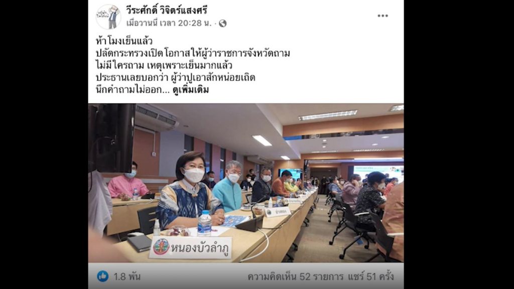 ล่าสุด นายวีระศักดิ์ วิจิตร์แสงศรี ผู้ว่าราชการจังหวัดอ่างทอง ได้ออกมาโพสต์ข้อความลงบนเฟซบุ๊กส่วนตัว เปิดเผย ประสบการณ์เฉียดตาย ที่พักรักษาตัวที่ศิริราช โดยระบุว่า… ห้าโมงเย็นแล้ว ปลัดกระทรวงเปิดโอกาสให้ผู้ว่าราชการจังหวัดถาม ไม่มีใครถาม เหตุเพราะเย็นมากแล้ว ประธานเลยบอกว่า ผู้ว่าปูเอาสักหน่อยเถิด นึกคำถามไม่ออก แค่เล่าสู่กันฟังแล้วกัน