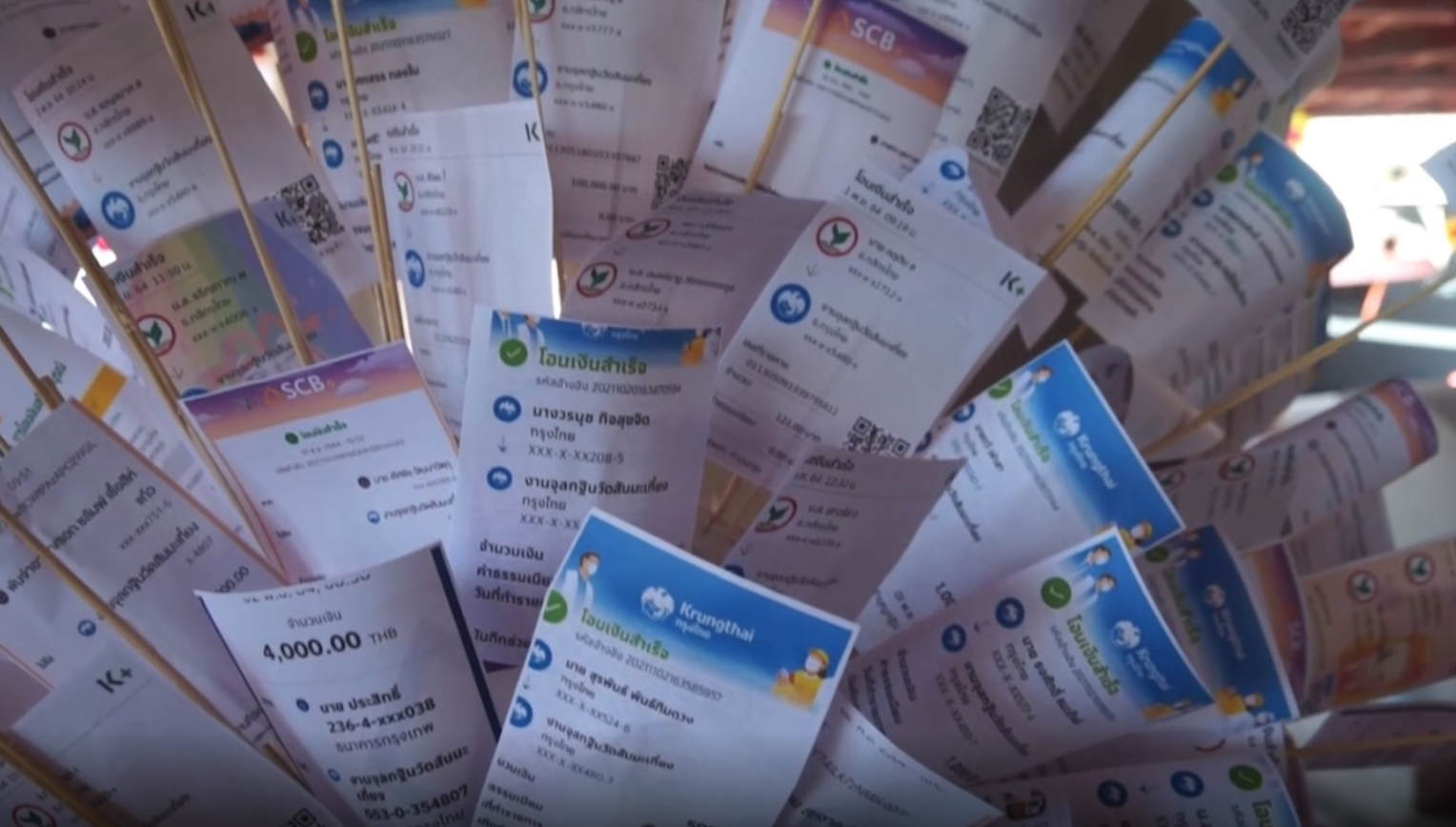 เชียงใหม่ 8 พ.ย.- วัดสันมะเกี๋ยง เชียงใหม่ นำสลิปการโอนเงินของญาติโยมมาเป็นต้นกฐิน ในงานทอดกฐินสามัคคีประจำปี 2564 ผู้ทำบุญไม่ต้องมาร่วมงาน เพื่อเว้นระยะห่างช่วงโควิด-19