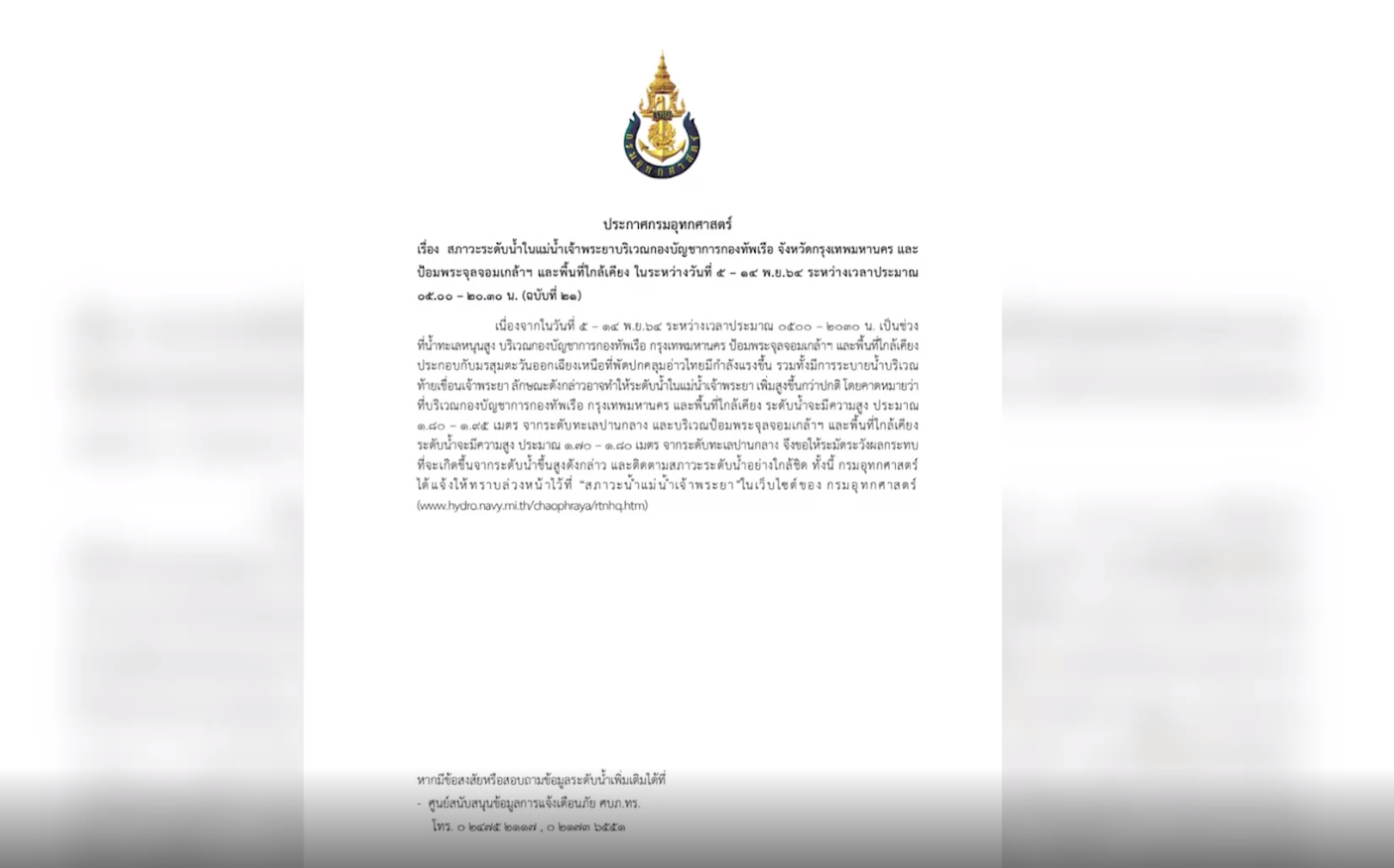 ตามประกาศกรมอุทกศาสตร์ เรื่อง สภาวะระดับน้ำในแม่น้ำเจ้าพระยา ฉบับที่ 21 ซึ่งระบุว่า ในวันที่ 5-14 พ.ย. 2564 ระหว่างเวลาประมาณ 05.00 – 20.30 น. เป็นช่วงที่น้ำทะเลหนุนสูง บริเวณกองบัญชาการกองทัพเรือ กรุงเทพมหานคร ป้อมพระจุลจอมเกล้าฯ และพื้นที่ใกล้เคียง ประกอบกับมรสุมตะวันออกเฉียงเหนือที่ปกคลุมอ่าวไทยมีกำลังแรงขึ้น รวมทั้งมีการระบายน้ำบริเวณท้ายเขื่อนเจ้าพระยา อาจทำให้ระดับน้ำในแม่น้ำเจ้าพระยาเพิ่มสูงขึ้นกว่าปกติ คาดว่าบริเวณกองบัญชาการกองทัพเรือ กรุงเทพมหานคร และพื้นที่ใกล้เคียง ระดับน้ำจะมีความสูงประมาณ 1.80 – 1.95 เมตร จากระดับทะเลปานกลาง และบริเวณป้อมพระจุลจอมเกล้า และพื้นที่ใกล้เคียงระดับน้ำจะมีความสูงประมาณ 1.70 -1.80 เมตร จากระดับทะเลปานกลาง ขอให้ระมัดระวังผลกระทบที่จะเกิดขึ้นจากระดับน้ำขึ้นสูงดังกล่าวและติดตามสภาวะระดับน้ำอย่างใกล้ชิดด้วย