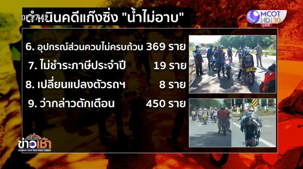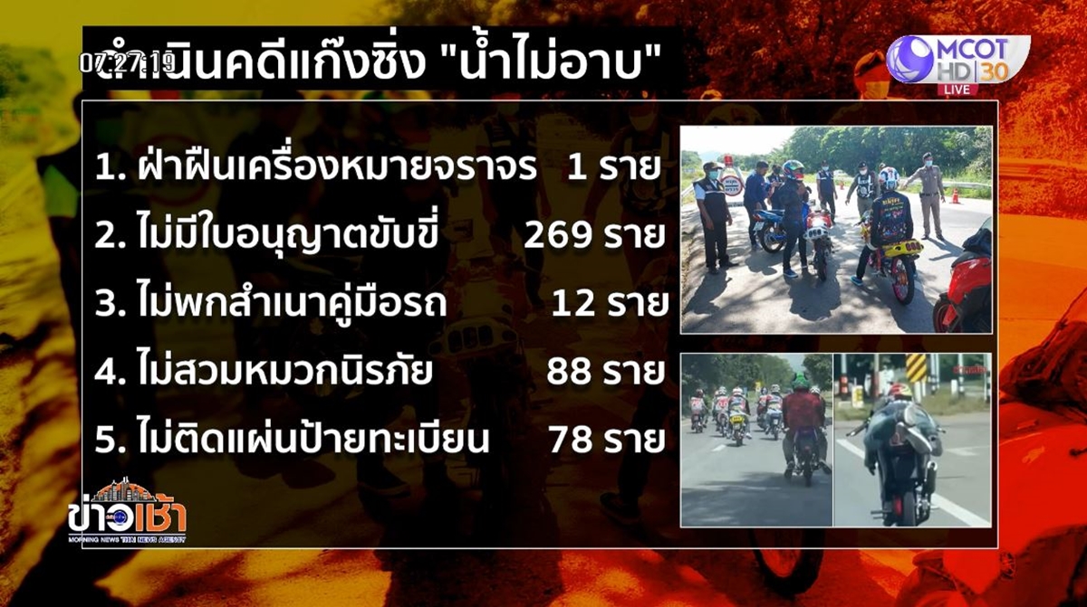 ยังเป็นประเด็นต่อเนื่อง กรณีกลุ่มจักรยานยนต์นัดรวมตัวกันจัดทริปชื่อว่า “ทริปน้ำไม่อาบ” โดยขี่รถจักรยานยนต์มุ่งหน้าขึ้นภูทับเบิก จ.เพชรบูรณ์ นับพันคัน ส่วนใหญ่เป็นรถแต่งซิ่ง มีการดัดแปลงสภาพ และก่อความเดือดร้อนรำคาญให้แก่ผู้ใช้รถใช้ถนน ทำให้ตำรวจต้องตั้งจุดสกัด และสามารถจับกุมได้จำนวนมากก่อนหน้านี้
