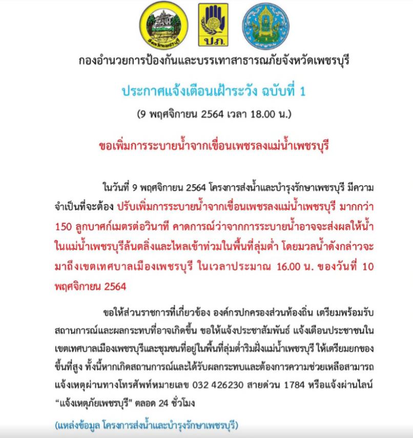 ด้านกองอำนวยการป้องกันและบรรเทาสาธารณภัยจังหวัด ออกประกาศแจ้งเตือนฉบับที่ 1 ตั้งแต่เมื่อวานนี้ (9 พ.ย.) ให้ประชาชนในเขตเทศบาลเมืองเพชรบุรีและชุมชนที่อยู่ในพื้นที่ลุ่มต่ำริมฝั่งแม่น้ำเพชรบุรียกของขึ้นที่สูง หากต้องการความช่วยเหลือสามารถแจ้งเหตุผ่านทางโทรศัพท์หมายเลข 032 426230 สายด่วน 1784