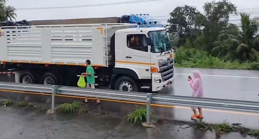 ชาวบ้าน ต.วิสัยเหนือ และวิสัยใต้ ที่อาศัยอยู่สองริมฝั่งถนนสายเอเชีย 41 นำอาหารบรรจุกล่องออกเดินเคาะประตูรถที่ติดอยู่บนถนน บริเวณ กม.31-กม.33 อ.สวี จ.ชุมพร ซึ่งติดเป็นระยะยาวเกือบ 20 กิโลเมตร ตั้งแต่เมื่อเวลา 20.00 น. เมื่อวานนี้ จนถึงตอนที่ชาวบ้านเอาข้าวไปแจกจ่ายก็เกือบ 20 ชั่วโมงแล้ว หลายคนยังไม่ได้กินข้าว ชาวบ้านจึงช่วยกันหุงหาอาหารบรรจุกล่องพร้อมน้ำมามอบให้เพื่อประทังความหิว บางคนบอกว่าเคยประสบเหตุต้องติดค้างอยู่บนท้องถนนเป็นวันๆ รู้ซึ้งดี จึงทำข้าวกล่องมาแจกจ่ายในครั้งนี้