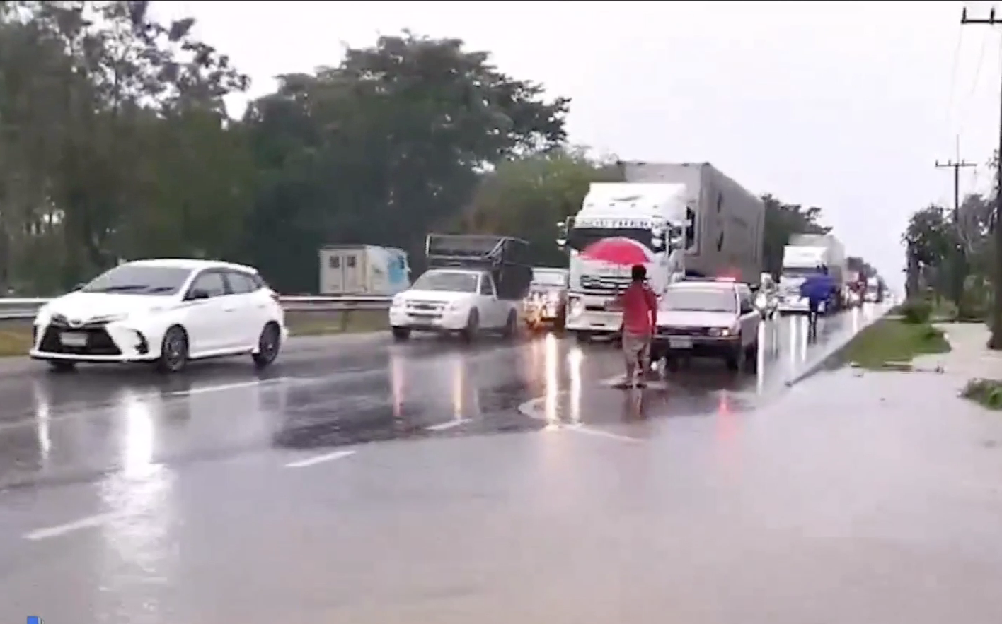 ที่ จ.ประจวบคีรีขันธ์ ฝนตกหนักต่อเนื่องมาสองวันแล้ว ครอบคลุมทั้งจังหวัด หนักสุดที่พื้นที่ อ.ทับสะแก ทำให้เกิดน้ำป่าไหลหลากลงมาจากเทือกเขาตะนาวศรี เข้าท่วมบ้านเรือนประชาชน และทะลักเข้าท่วมถนนเพชรเกษม บริเวณยูเทิร์นร้านรุ่งฟ้า ระหว่างหลัก กม.ที่ 355-356 หมู่ที่ 5 ต.นาหูกวาง ระดับน้ำท่วมผิวจราจรตั้งแต่ 20-80 เซนติเมตร ทำให้รถติดยาว ทั้งขาขึ้น กทม.และขาล่องใต้ไปยัง 14 จังหวัด ต้องบีบถนนเหลือเลนกลางเลนเดียว เพื่อระบายรถไม่ให้ติดขัด ล่าสุดรถใหญ่ยังเคลื่อนตัวได้ช้า ส่วนรถเล็กบางคันไม่เสี่ยง ต้องจอดพักก่อนที่จะถึงจุดดังกล่าว