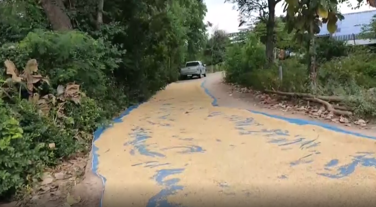 วันนี้ (16 พ.ย.64) ผู้สื่อข่าวลงพื้นที่ไปยังบ้านจาน ต.หนองยายพิมพ์ พบว่าล่าสุดมีการนำกรวยยาง สุ่มไก่ และป้ายที่ปิดกั้นอยู่หน้าปากซอยออก ส่วนข้าวเปลือกที่ตากตามถนนในซอยบางส่วนก็มีการเก็บบ้างแล้ว บางจุดก็ลดพื้นที่ตากลงเหลือเลนเดียว เพื่อเว้นช่องว่างให้รถสามารถสัญจรได้ ไม่ให้เกิดผลกระทบกับผู้สัญจร