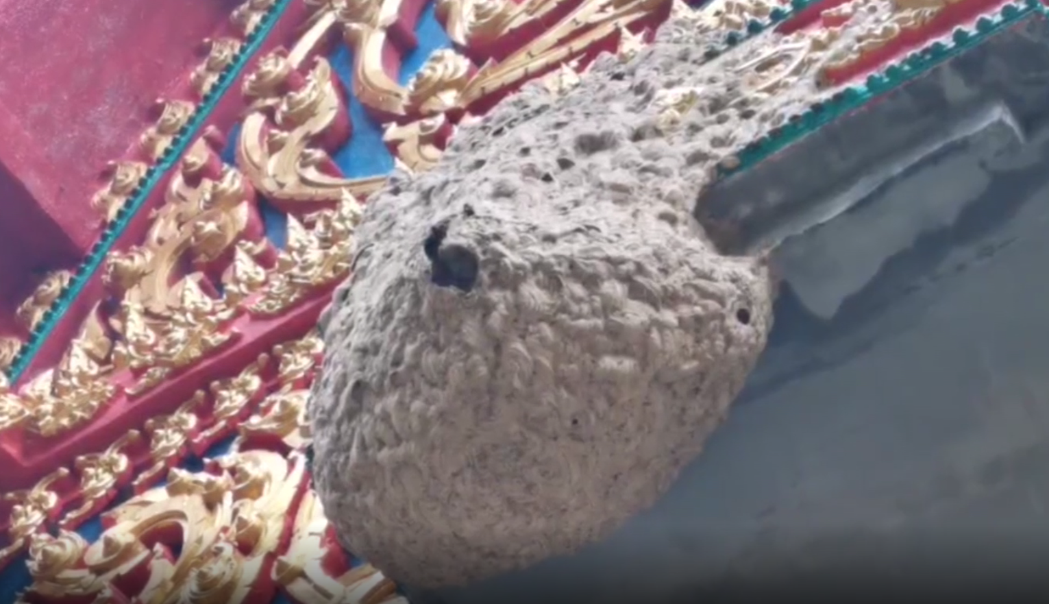 สุราษฎร์ธานี 16 พ.ย.- ผึ้งหลวงทำรังบริเวณหน้าจั่วช่อฟ้าอุโบสถวัดดัง อ.ไชยา จ.สุราษฎร์ธานี ไม่เคยต่อยหรือทำร้ายใคร อยู่ปลอดภัยทั้งพระ เณรและชาวบ้านยาวนานกว่า 8 ปี
