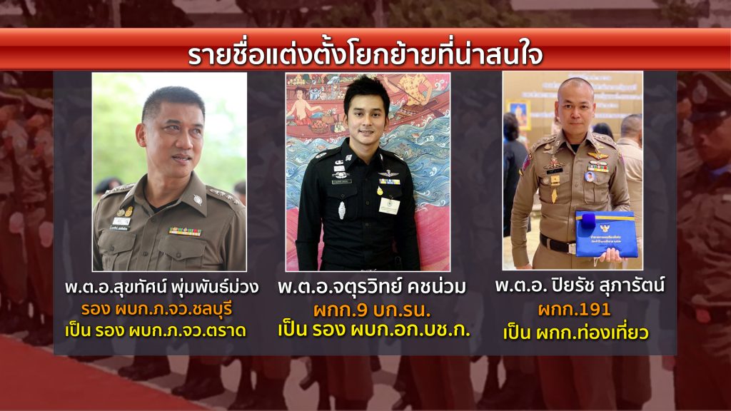 พันตำรวจเอก สุขทัศน์ พุ่มพันธ์ม่วง รองผู้บังคับการตำรวจภูธรจังหวัดชลบุรี เป็นรองผู้บังคับการตำรวจภูธรจังหวัดตราด พันตำรวจเอกจตุรวิทย์ คชน่วม ผู้กำกับการ 9 กองบังคับการตำรวจน้ำ ขยับขึ้นรองผู้บังคับการอำนวยการ กองบัญชาการตำรวจสอบสวนกลาง ขณะที่ พันตำรวจเอก ปิยรัช สุภารัตน์ ผู้กำกับการสายตรวจและปฏิบัติการพิเศษ (191) โยกเป็น ผกก.ท่องเที่ยว