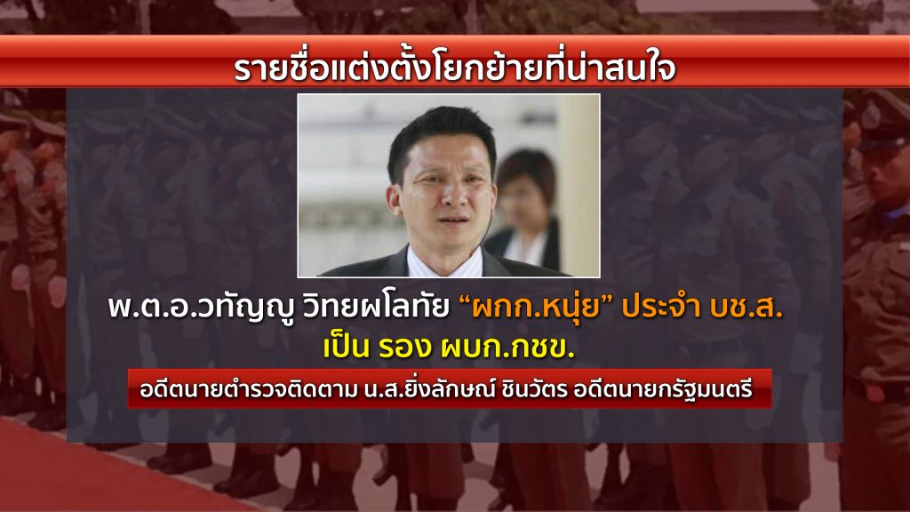 ขณะที่ พันตำรวจเอก วทัญญู วิทยผโลทัย หรือผู้กำกับหนุ่ย ประจำกองบัญชาการตำรวจสันติบาล ซึ่งในอดีตเป็นนายตำรวจติดตาม นางสาวยิ่งลักษณ์ ชินวัตร อดีตนายกรัฐมนตรี ได้ขยับเป็น รองผู้บังคับการกลุ่มงานผู้เชี่ยวชาญการข่าว กองบัญชาการตำรวจสันติบาล (รอง ผบก.กชข.).-สำนักข่าวไทย