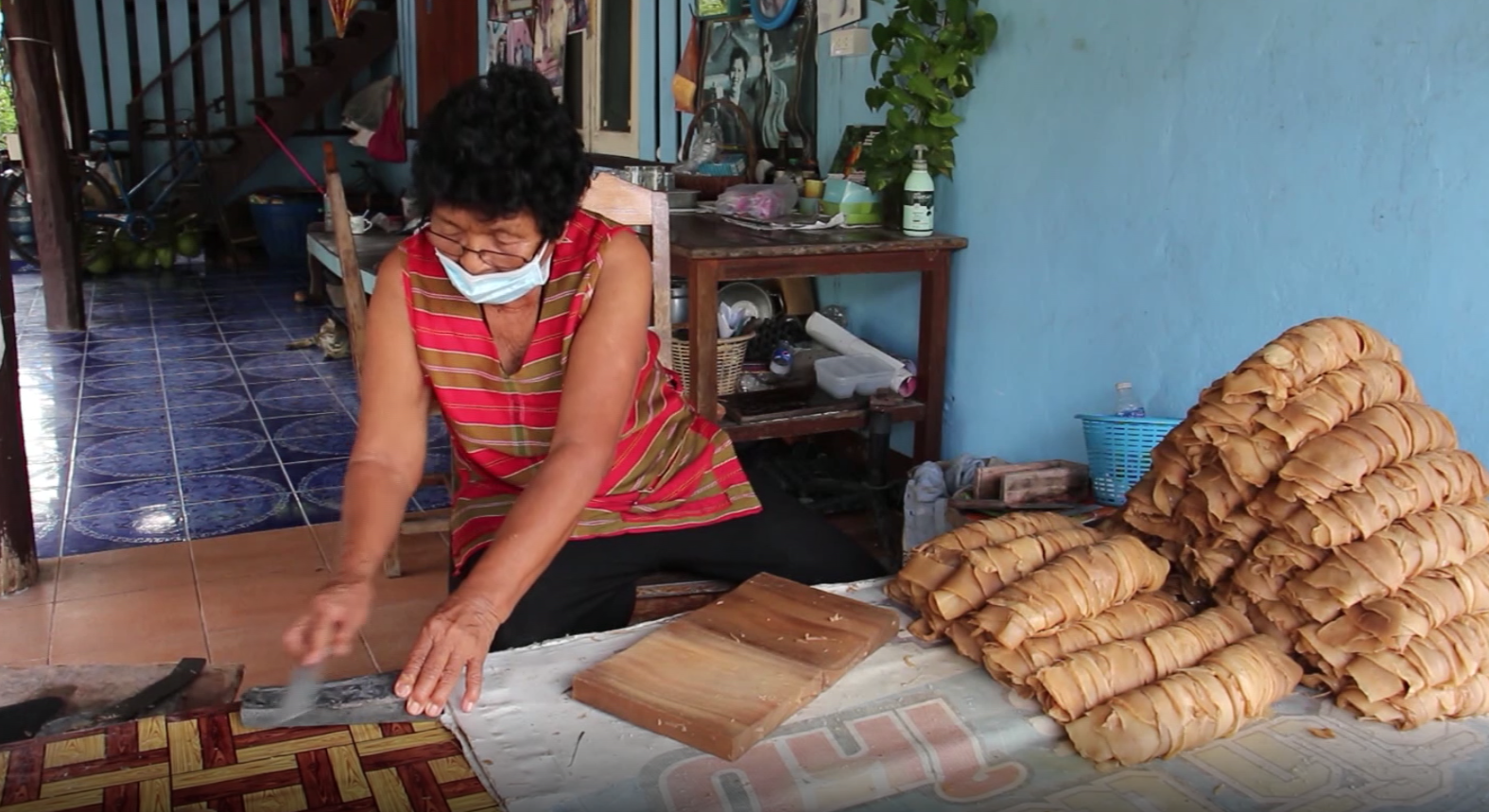 ด้วยความที่คุณยายอายุมากแล้ว และเหลือคนสุดท้ายในตำบลที่ยังรับจ้างแล่ และหั่นหัวไชโป๊อยู่ ได้พูดคุยสอบถามความเป็นอยู่ในช่วงสถานการณ์โควิด -19 ซึ่งคุณยายได้ให้ข้อมูลถึงการยึดอาชีพรับจ้างแล่หัวไชโป๊อยู่กับบ้านปลอดภัยจากโรค แถมมีเงินเลี้ยงตัวเองอยู่อย่างพอเพียงในช่วงนี้ โดยจะมีเถ้าแก่นำหัวไชโป๊ที่ผ่านกรรมวิธีหมักมาแล้ว นำมาให้คุณยายแล่หั่นเป็นชิ้นบาง ๆ และหั่นเป็นเส้นเล็ก ๆ ก่อนนำไปผ่านกระบวนการทำอีกหลายขั้นตอนปรุงตามรสชาติ ถึงจะนำไปบรรจุถุงจำหน่ายมีหลายรูปแบบ เช่น แบบเส้น แบบแว่น เป็นลูกเต๋า ขาย 3 กล่อง 100 บาท บรรจุใส่ถุงกระดาษติดโลโก้สวยงาม