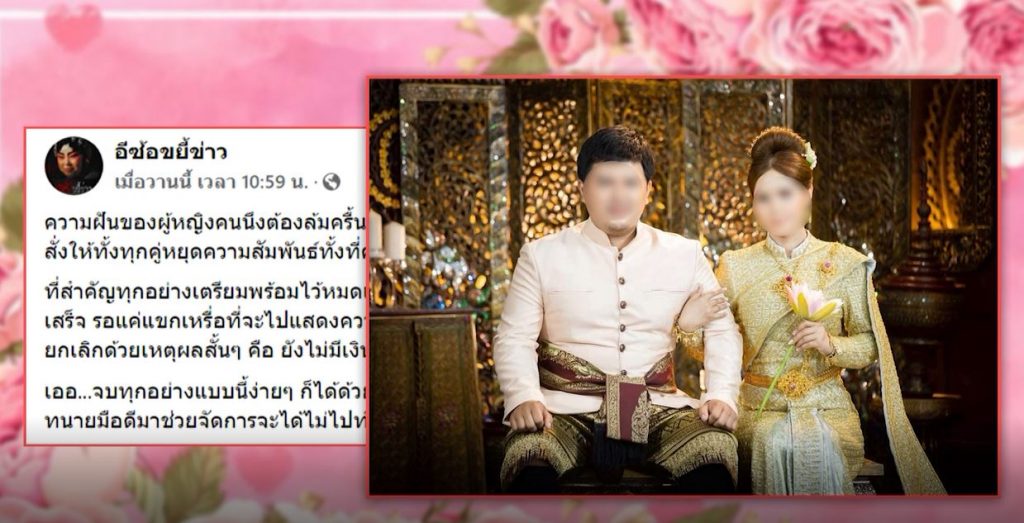 เหตุการณ์นี้โด่งดังขึ้นเมื่อเพจเฟซบุ๊ก “อีซ้อขยี้ข่าว” โพสต์เรื่องราวสุดเศร้าของเจ้าสาว โดยบอกว่าความฝันของผู้หญิงคนหนึ่งต้องล้มครื้นลงทันที หลังถูกฝ่ายชายและทางญาติยกเลิกการจัดงานแต่งไปอย่างดื้อๆ สั่งให้ทั้งคู่หยุดความสัมพันธ์ ทั้งที่คบกันมานานถึง 9 ปี ที่สำคัญทุกอย่างเตรียมพร้อมไว้หมดแล้ว ไม่ว่าจะเป็นสถานที่ การ์ดเชิญ ของชำร่วย รวมถึงเรือนหอที่ใกล้เสร็จ รอแค่แขกที่จะไปแสดงความยินดีกับงานแต่งที่จะเกิดขึ้นในอีกไม่กี่วัน จู่ๆ ญาติฝ่ายชายโทรมายกเลิกด้วยเหตุผลสั้นๆ คือยังไม่มีเงินสินสอด เออ…จบทุกอย่างแบบนี้ง่ายๆ ก็ได้ด้วย เห็นใจผู้หญิง เสียทั้งเงิน เสียทั้งความรู้สึก แถมเสียหน้าอีก แบบนี้น่าหาทนายมือดีมาช่วยจัดการจะได้ไม่ไปทำกับคนอื่น