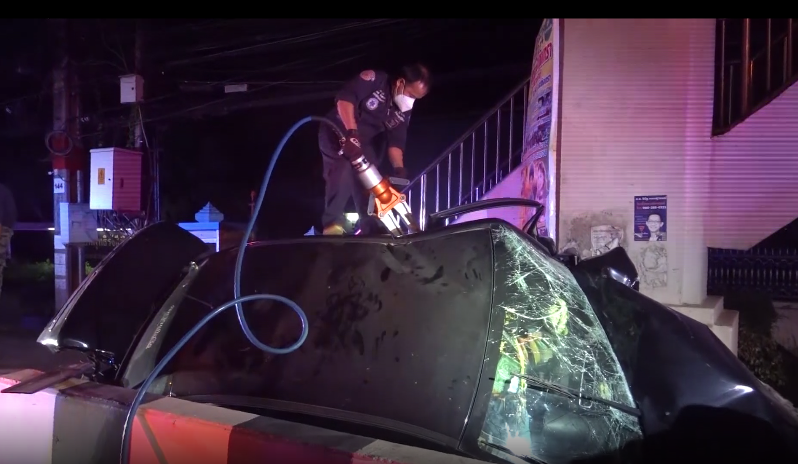 ตำรวจ สภ.แสนภูดาษ จ.ฉะเชิงเทรา พร้อมหน่วยกู้ภัยฉะเชิงเทรา อุปกรณ์ตัดถ่าง ตรวจสอบเหตุรถชนตอม่อสะพานลอยหน้าโรงเรียนพุทธิรังสีพิบูล ถนนสิริโสธร ขาเข้าฉะเชิงเทรา พบรถเก๋งเสียหลักชนอัดติดตอม่อสะพานลอย จนพังเสียหายทั้งคัน บริเวณนอกรถพบคนขับบาดเจ็บเล็กน้อยยืนอยู่ พร้อมบอกว่าเพื่อนที่มาด้วยกันติดอยู่ในรถบริเวณเบาะหลัง เจ้าหน้าที่ต้องใช้อุปกรณ์ตัดถ่างประมาณ 10 นาที ก่อนจะช่วยเหลือนำตัวออกมาได้ พบว่าบาดเจ็บอาการสาหัส หมดสติ จึงรีบปฐมพยาบาลก่อนนำส่งโรงพยาบาลบ้านโพธิ์ทั้งสองคน สอบสวนคนขับให้การว่าขณะที่กำลังขับรถกลับที่พัก หลังจากไปรับเพื่อนมาจากแสนภูดาษ พอมาถึงที่เกิดเหตุเกิดหลับในทำให้รถเสียหลักพุ่งเข้าข้างทางแล้วเหินแบบริเออร์ ก่อนชนอัดตอม่อสะพานลอยเต็มแรงจนได้รับบาดเจ็บดังกล่าว