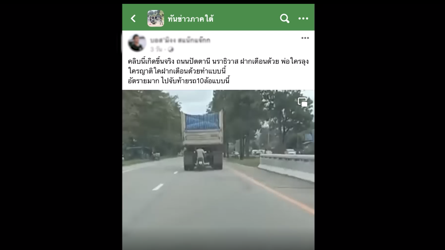 กรณีผู้ใช้เฟซบุ๊กชื่อ “บอส มิงง สแน๊กแจ๊กก” โพสต์คลิปภาพชายคนหนึ่งขี่รถจักรยานยนต์ ใช้มือเกาะท้ายรถสิบล้อขณะวิ่งไปบนถนน น่าหวาดเสียว ระบุข้อความ “คลิปนี้เกิดขึ้นจริงถนนปัตตานี-นราธิวาส ฝากเตือนด้วย พ่อใคร ลุงใคร ญาติใครฝากเตือนด้วยทำแบบนี้อันตรายมาก ไปจับท้ายรถสิบล้อแบบนี้