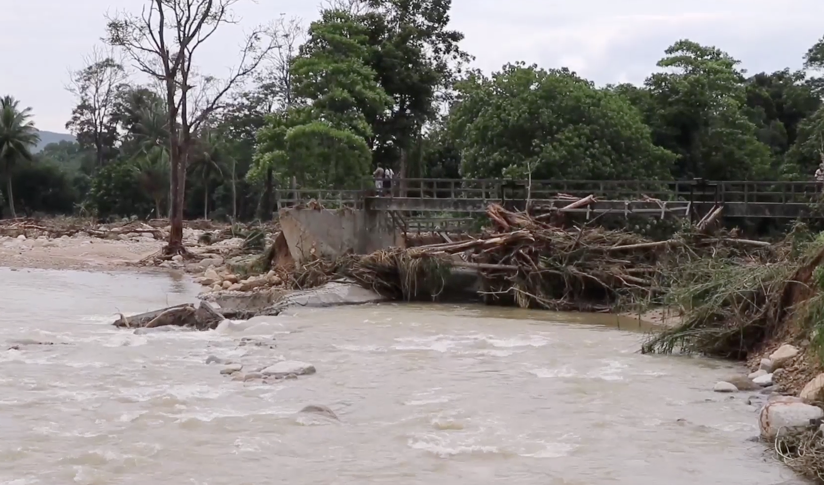 ตรัง 4 ธ.ค.- สถานการณ์น้ำในภาคใต้หลายจังหวัดเริ่มดีขึ้น เนื่องจากฝนหยุดตก แต่ที่ จ.ตรัง ยังน่าห่วงเพราะฝนตกหนัก เกิดดินโคลนถล่ม พัดเอาต้นไม้ใหญ่ทำหูประตูคอนกรีตฝายน้ำล้นแตก