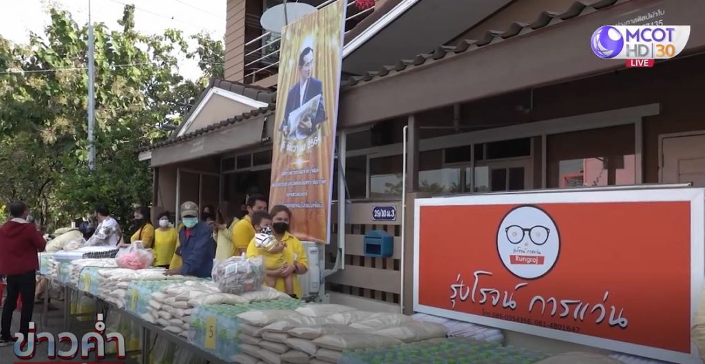 ขณะที่สองสามีภรรยา เจ้าของร้านรุ่งโรจน์การแว่น ต.บางวัว อ.บางปะกง จ.ฉะเชิงเทรา ชักชวนกลุ่มเพื่อน เหมาข้าวหอมมะลิจากเกษตรกรใน จ.บุรีรัมย์ 2 ตัน มาแยกบรรจุถุงละ 3 กิโลกรัม นอกจากนี้ยังมีน้ำดื่ม 500 แพ็ก น้ำยาล้างจาน ไข่ไก่ ขนม ปฏิทิน เพื่อนำไปแจกให้ชาวบ้านฟรี เนื่องในวันคล้ายวันพระบรมราชสมภพ ในหลวงรัชกาลที่ 9 และวันพ่อแห่งชาติ เหมือนเช่นทุกปีที่ผ่านมา ชาวบ้านที่ทราบข่าวต่างมายืนต่อแถวเพื่อรอรับของจำนวนมาก โดยมีเจ้าหน้าที่ อสม.ตำบลบางวัว มาช่วยคัดกรอง และตรวจวัดอุณหภูมิ