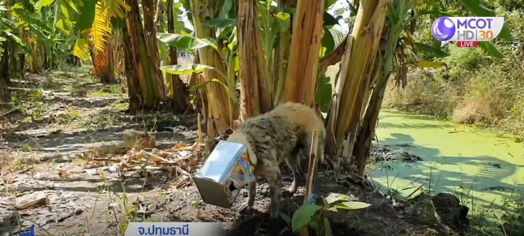 ที่จังหวัดปทุมธานี พบสุนัขหัวเข้าไปติดอยู่ในปี๊บ เอาออกไม่ได้ จนชาวบ้านสงสาร ต้องเรียกเจ้าหน้าที่กู้ภัยมาช่วย
