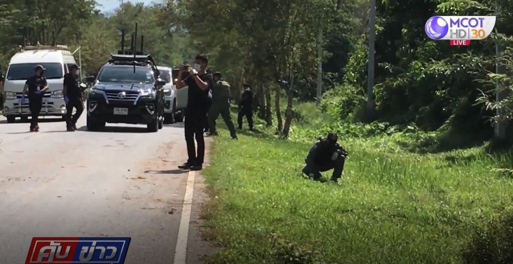 พบที่โคนเสาปูนซีเมนต์ ป้ายสัญลักษณ์บอกเส้นทาง ซึ่งเป็นจุดที่คนร้ายลอบวางระเบิด ถูกแรงระเบิดจนเสาหักเป็น 3 ส่วน ล้มลงมากองกับพื้น และมีหลุมลึก 30 ซม. กว้าง 100 ซม. เศษซากชิ้นส่วนของระเบิดแสวงเครื่องที่คนร้ายประกอบใส่ไว้ในถังแก๊สปิกนิก หนัก 25 กก. จุดชนวนด้วยวิทยุสื่อสาร ตกกระจายเกลื่อนพื้นถนนและพงหญ้าริมทาง