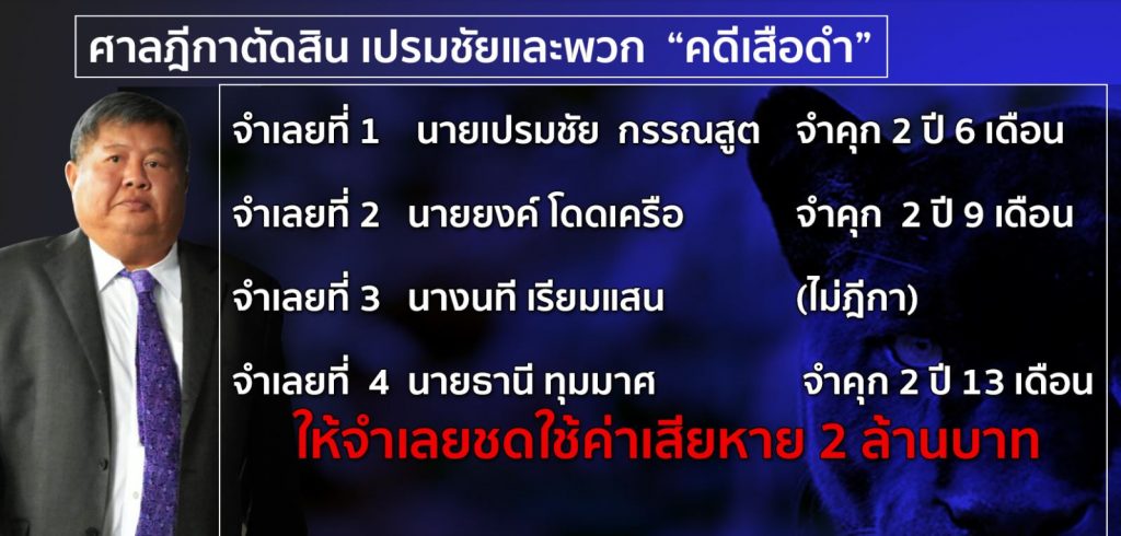 จำเลยที่ 1 นายเปรมชัย คงจำคุก 2 ปี 6 เดือน , จำเลยที่ 2 นายยง คงจำคุก 2 ปี 9 เดือน , จำเลยที่ 4 นายธานี คงจำคุก 2 ปี 13 เดือน ให้จำเลยชดใช้ค่าเสียหาย 2 ล้านบาท ตามคำพิพากษาศาลชั้นต้น และศาลอุทธรณ์ แต่ให้ปรับแก้ไขดอกเบี้ยให้เป็นไปตามกฎหมายใหม่. – สำนักข่าวไทย