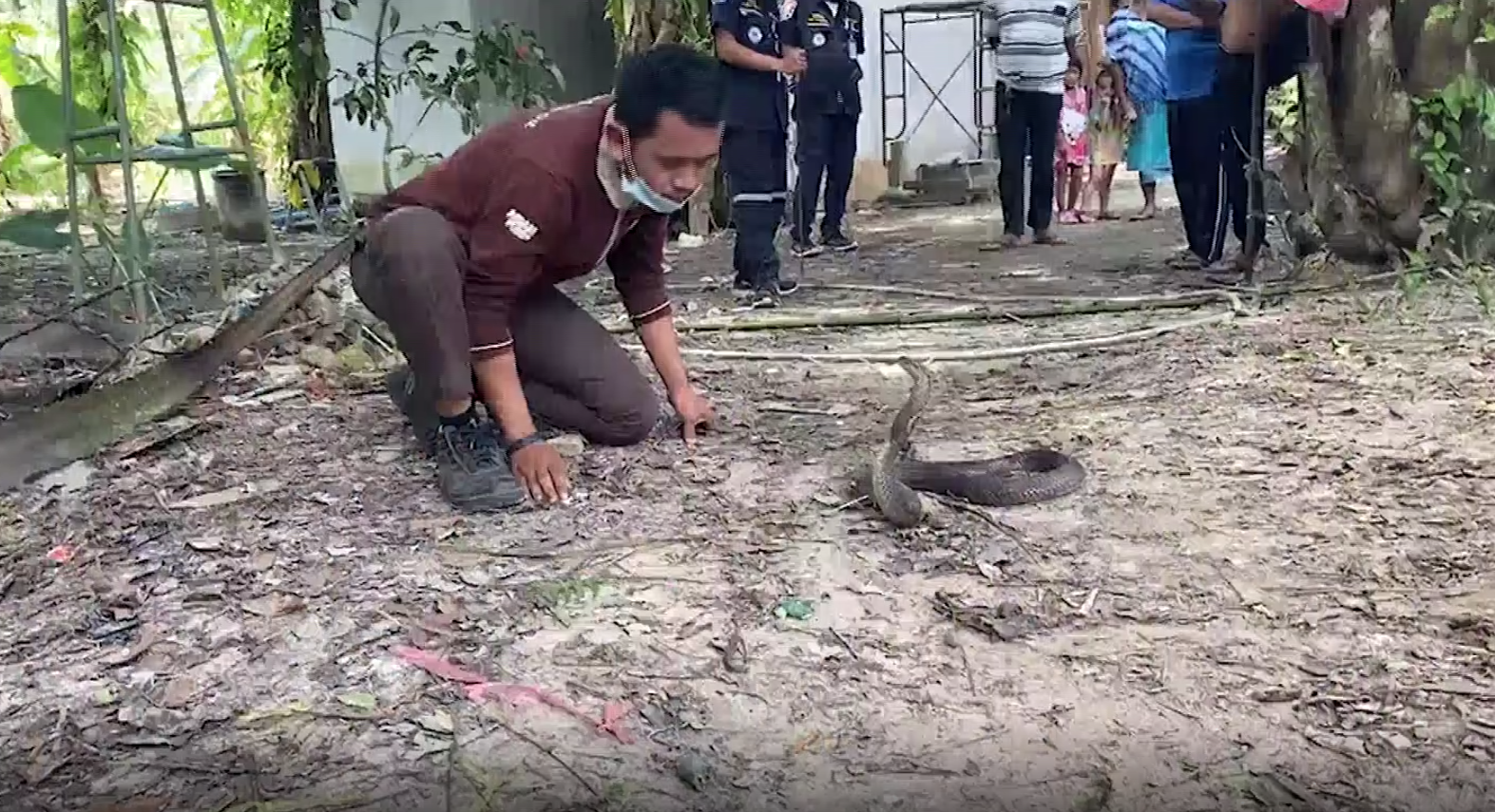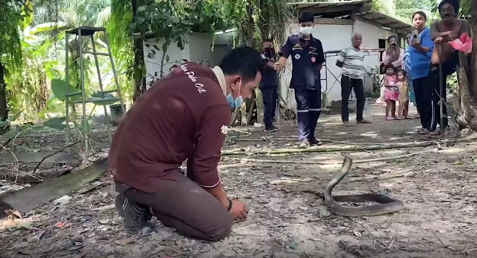 ไม่นานเจ้าหน้าที่ก็ใช้มือเปล่ายื่นออกไปตรงๆ ตอนที่งูกำลังแผ่แม่เบี้ย แล้วรวบคองูได้อย่างง่ายดาย ใช้เวลาไม่ถึง 5 นาที ก่อนจับใส่กระสอบเพื่อนำไปปล่อยคืนสู่ป่าธรรมชาติ