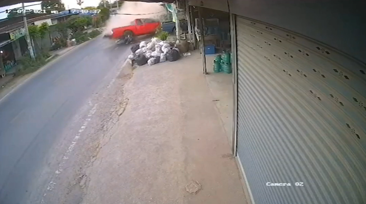 กล้องวงจรปิดจับภาพนาทีระทึก รถกระบะอีซูซุ สีแดง แต่งซิ่ง ทะเบียน ผษ 7045 นครราชสีมา พุ่งชนรถเก๋งที่จอดข้างทาง ก่อนเสียหลักหมุนคว้างหลายตลบ ชนรถยนต์และรถจักรยานยนต์ที่จอดข้างทางเสียหายหลายคัน ก่อนพุ่งชนร้านค้าใกล้เคียง ชาวบ้านวิ่งหนีตายจ้าละหวั่น เหตุเกิดบริเวณถนนกลางตลาดป่าไผ่ หมู่ 1 ต.จันทึก อ.ปากช่อง จ.นครราชสีมา