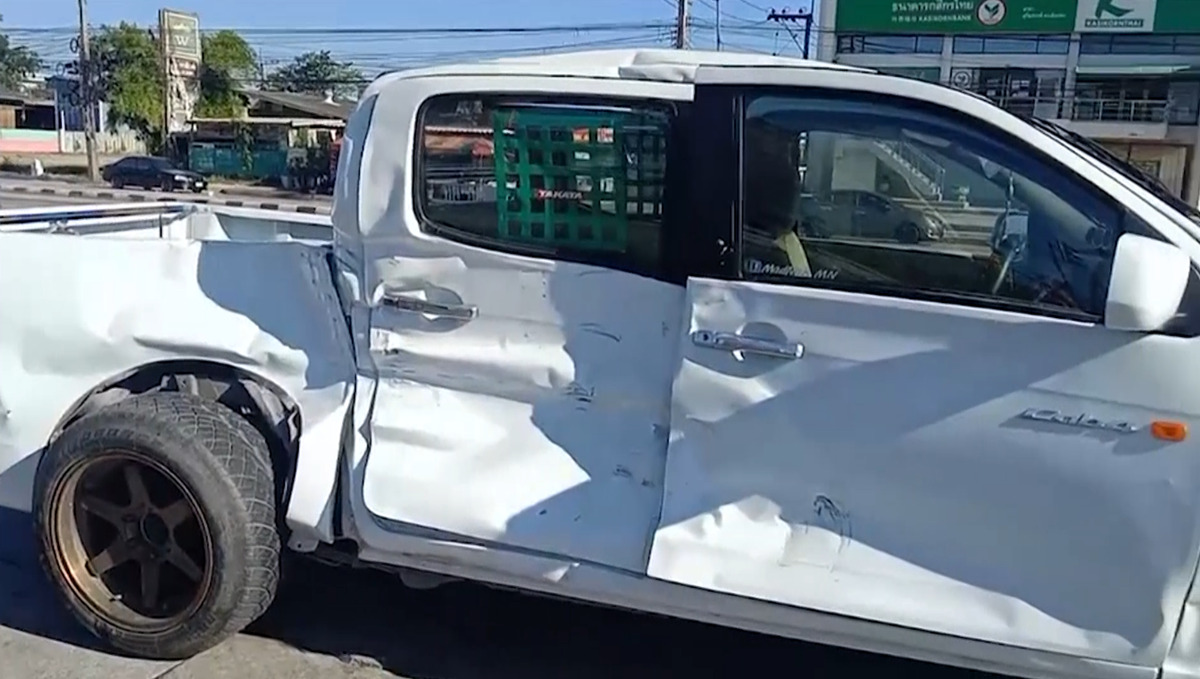 กล้องวงจรปิดบริเวณตลาดสุวินทวงศ์ อ.บางน้ำเปรี้ยว จ.ฉะเชิงเทรา จับภาพขณะรถกระบะสีขาว 4 ประตู ที่อยู่เลนในสุด หักขวาตัดหน้ารถบรรทุก 18 ล้อ เพื่อกลับรถ ทั้งที่จุดกลับรถอยู่ห่างไม่เกิน 500 เมตร ทำให้รถบรรทุกที่วิ่งอยู่เลนขวาพุ่งชนเต็มแรง รถกระบะได้รับความเสียหาย ฝั่งขวาถูกชนยับ กระบะฉีก ไฟเลี้ยวแตก ฝาถังน้ำมันหลุด ส่วนคนขับคือ นายมูฮัมหมัด พุ่มประดิษฐ อายุ 20 ปี ได้รับบาดเจ็บเล็กน้อยที่บริเวณลำคอ ขณะที่คู่กรณี นายสถาพร เครือแส อายุ 37 ปี คนขับรถบรรทุก 18 ล้อ ไม่ได้รับบาดเจ็บ ส่วนรถมีร่องรอยการเฉี่ยวชนที่กันชนด้านหน้า