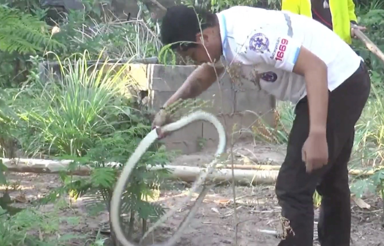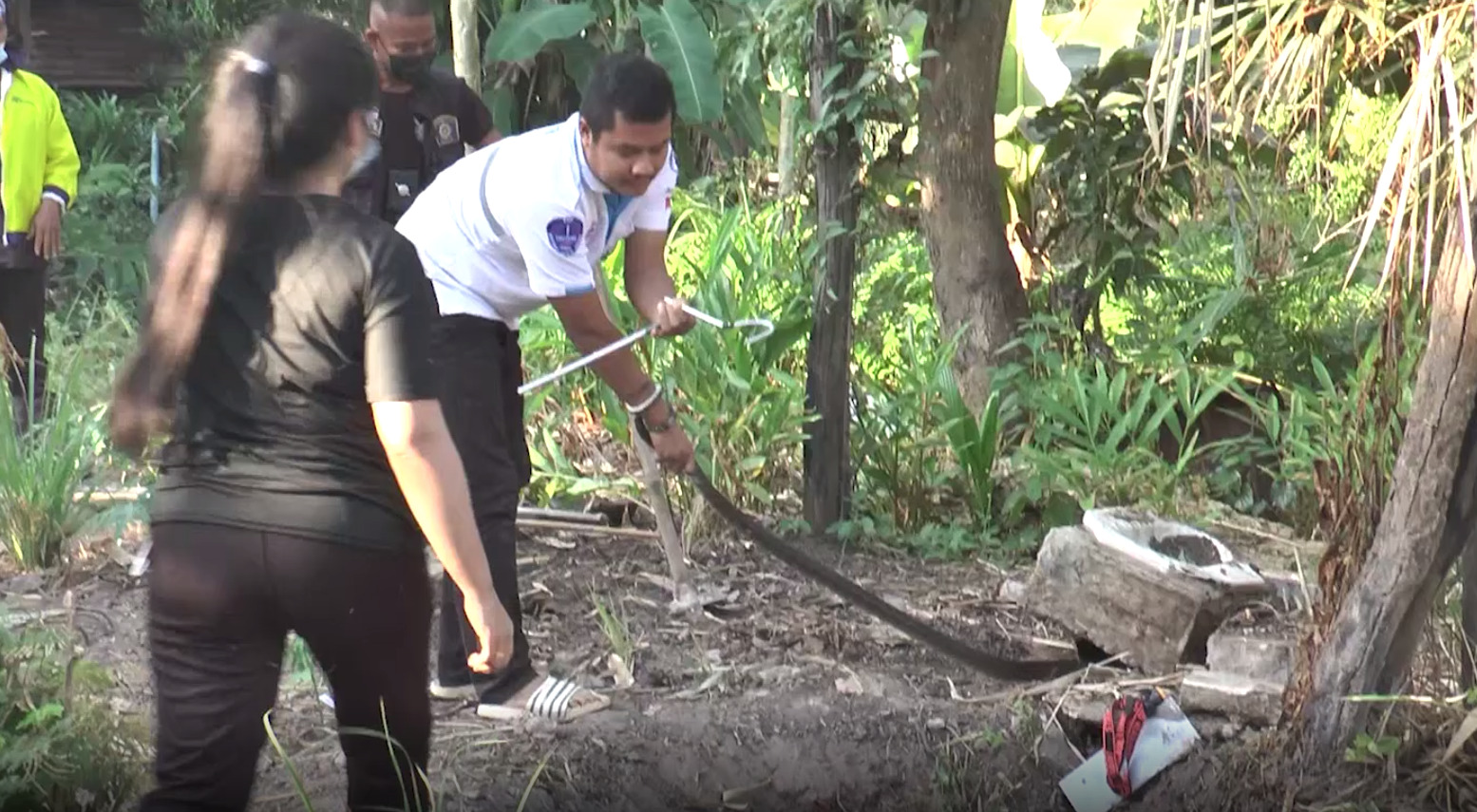 ปราจีนบุรี 13 ธ.ค.- ชาวบ้านคลองตาหมื่น อ.นาดี จ.ปราจีนบุรี แจ้งตำรวจมาจับงูจงอาง 2 ตัว จะเข้าบ้าน แต่ทั้งโรงพักไม่มีใครมีความสามารถจับได้ สุดท้ายต้องให้ผู้เชี่ยวชาญมาจัดการ ปรากฏว่าไม่ใช่จงอาง แต่เป็นงูสิงยาวเกือบ 3 เมตร จึงนำใส่ถุงปล่อยคืนสู่ธรรมชาติ