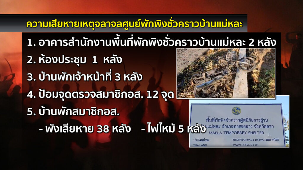 โดยทรัพย์สินที่เสียหายมีหลายรายการ ประกอบด้วย อาคารสำนักงานพื้นที่พักพิงชั่วคราวบ้านแม่หละ 2 หลัง ห้องประชุม 1 หลัง บ้านพักเจ้าหน้าที่ 3 หลัง ป้อมจุดตรวจสมาชิกอส. 12 จุด บ้านพักสมาชิก อส. พังเสียหาย 38 หลัง และไฟไหม้ 5 หลัง รถยนต์ 10 คัน จักรยานยนต์ 74 คัน และปืนส่วนตัวสมาชิก อส. 2 กระบอก.-สำนักข่าวไทย
