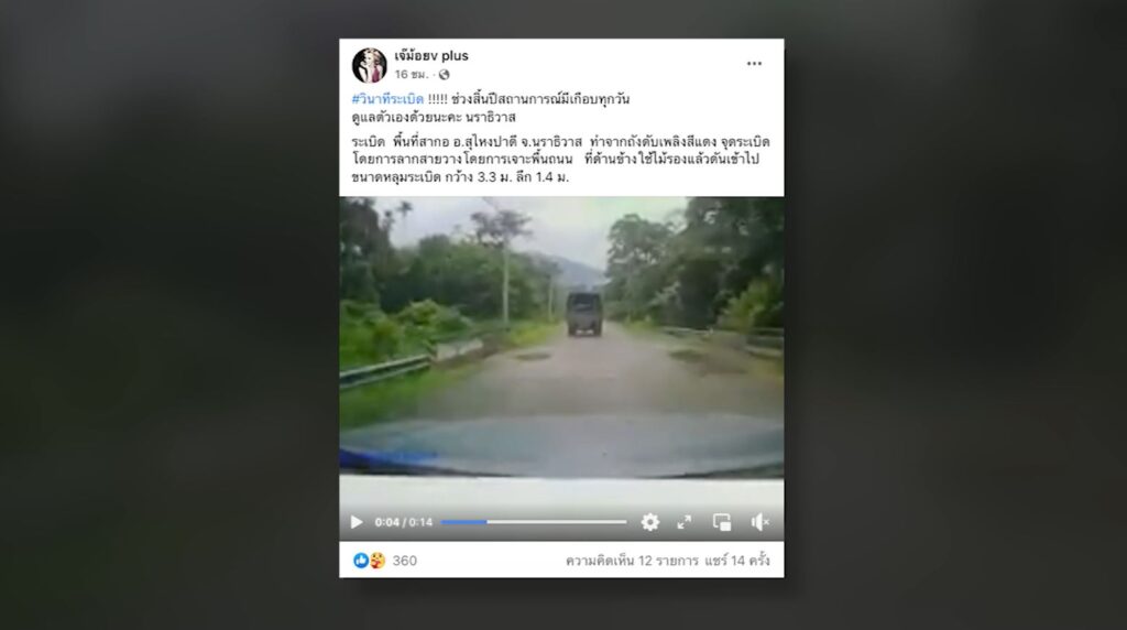 โดยเพจเฟซบุ๊กเจ๊ม้อย v plus เป็นผู้นำคลิปนี้มาโพสต์ พร้อมระบุข้อความว่า “วินาทีระเบิด ช่วงสิ้นปีสถานการณ์มีเกือบทุกวัน ดูแลตัวเองด้วยนะคะ นราธิวาส ระเบิด พื้นที่สากอ อ.สุไหงปาดี จ.นราธิวาส