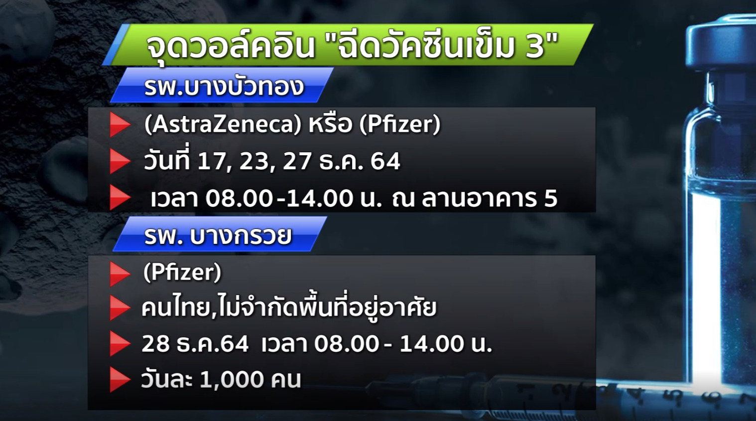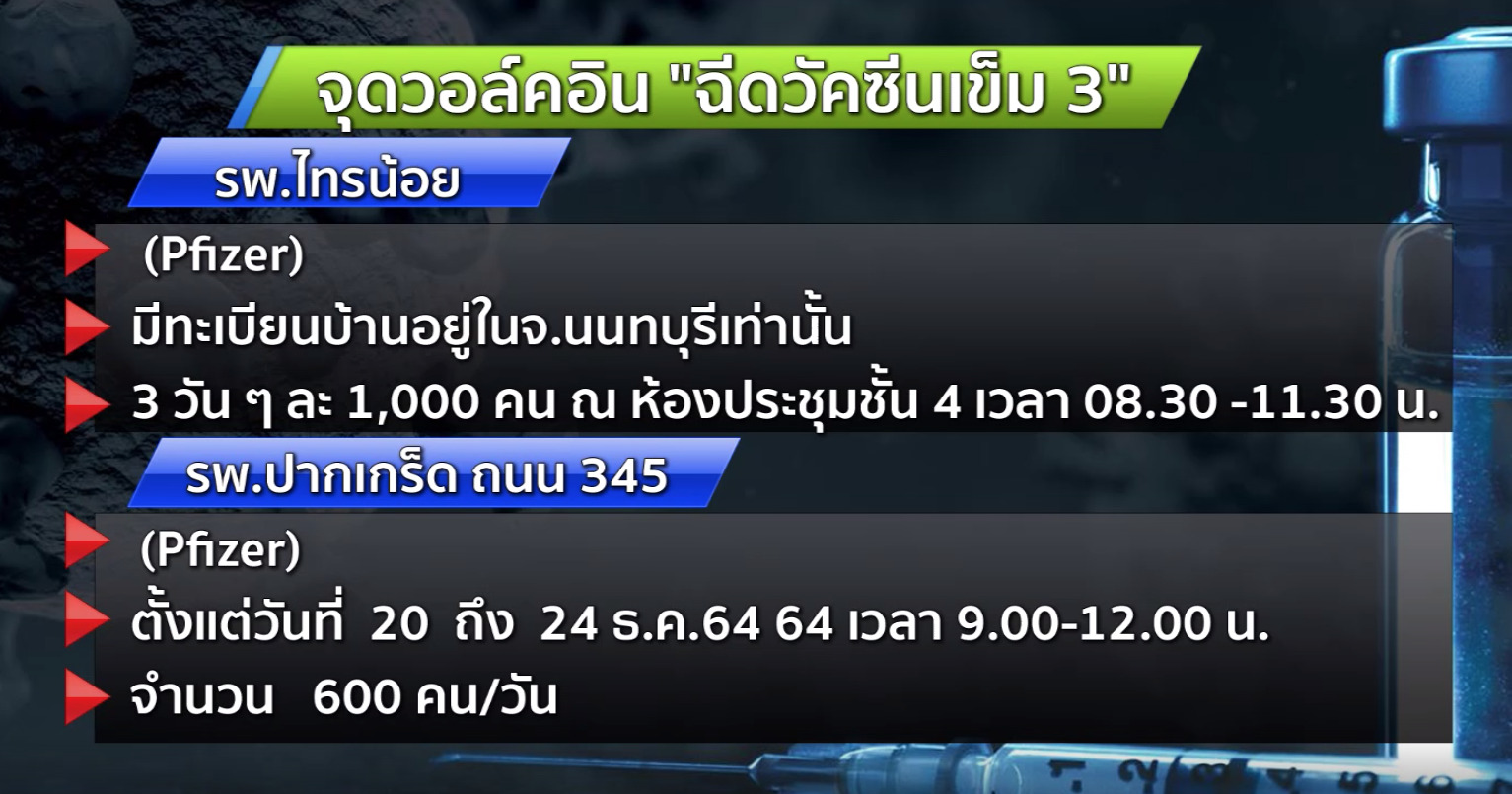 ส่วนความคืบหน้าการฉีดวัคซีนโควิด –19 ล่าสุดมีหลายโรงพยาบาลในจังหวัดนนทบุรี เปิดให้ประชาชน วอล์กอิน ฉีดวัคซีนไฟเซอร์ เข็มบูสเตอร์เข็ม 3 เช่น โรงพยาบาลปากเกร็ด ถนน 345 โรงพยาบาลบางบัวทอง, โรงพยาบาลไทรน้อย, โรงพยาบาลบางกรวย โดยรับตั้งแต่ 500 คน ถึง 1,000 คน ใครสนใจไปดูได้ว่าเดินทางไปโรงพยาบาลไหนสะดวก.-สำนักข่าวไทย