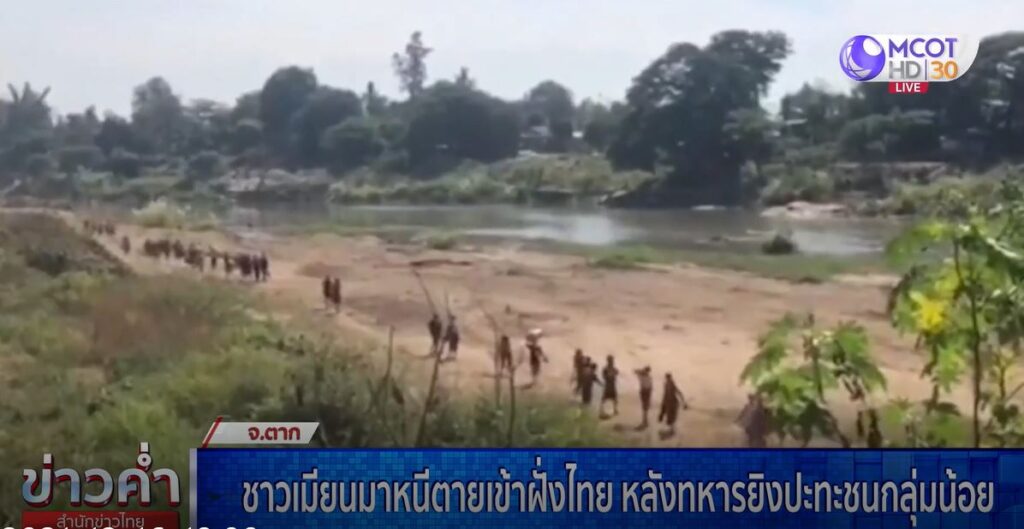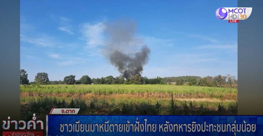 ตาก 16 ธ.ค. – ชาวเมียนมานับพันคนหนีตาย อพยพข้ามแม่น้ำเมย หลังทหารยิงปะทะชนกลุ่มน้อย ฝั่งตรงข้ามกับ อ.แม่สอด จ.ตาก เสียงปืนดังสนั่นได้ยินถึงฝั่งไทย เจ้าหน้าที่ฝ่ายความมั่นคง อ.แม่สอด ตรึงกำลังตลอดแนวชายแดน