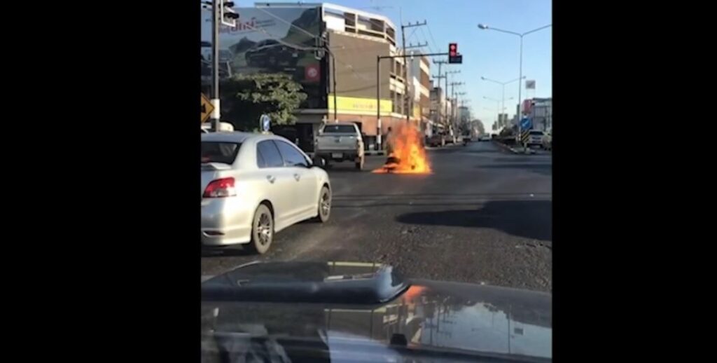 อำนาจเจริญ 17 ธ.ค.-วุ่นทั้งเมือง วงจรปิดเผยภาพ มือดีขับรถกระบะ 4 ประตู มาจอดกลางสี่แยกไฟแดงกลางเมืองอำนาจเจริญ จากนั้นนำยางรถยนต์ลงมาวาง แล้วราดน้ำมันจุดไฟเผา ทำรถติดยาว